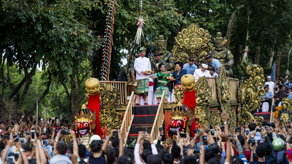 Presiden Joko Widodo (kiri) didampingi Ibu Negara Iriana Joko Widodo melambaikan tangan ketika mengikuti Pawai Pesta Kesenian Bali ke-40 di Denpasar, Bali. Pesta Kesenian Bali yang mengangkat tema Teja Dharmaning Kauripan, Api Spirit Penciptaan menampilkan berbagai kesenian dari perwakilan dari Pemerintah Provinsi Bali, sembilan kabupaten/kota di Bali, sejumlah universitas di Bali serta peserta dari luar negeri dan berlangsung 23 juni - 21 Juli mendatang. ANTARA FOTO/Wahyu Putro A