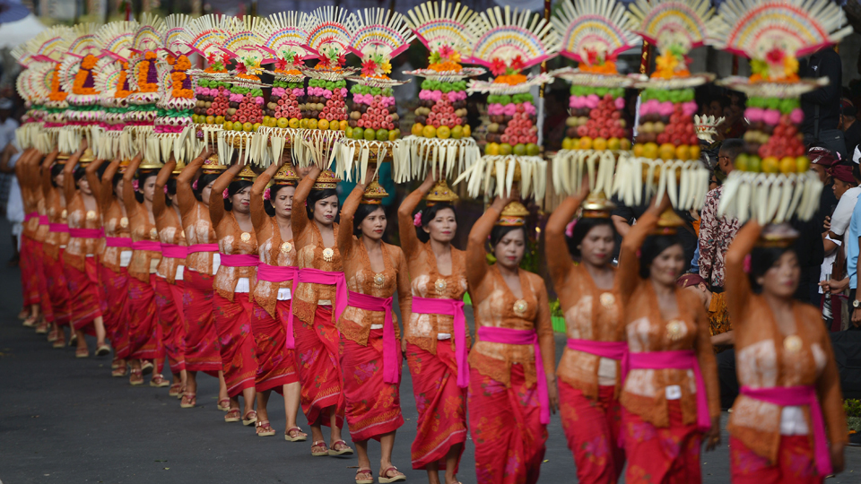 Peserta membawa Gebogan ketika mengikuti Pawai Pesta Kesenian Bali ke-40 di Denpasar, Bali. Pesta Kesenian Bali yang mengangkat tema Teja Dharmaning Kauripan, Api Spirit Penciptaan menampilkan berbagai kesenian dari perwakilan dari Pemerintah Provinsi Bali, sembilan kabupaten/kota di Bali, sejumlah universitas di Bali serta peserta dari luar negeri dan berlangsung hingga 21 Juli mendatang. ANTARA FOTO/Wahyu Putro A