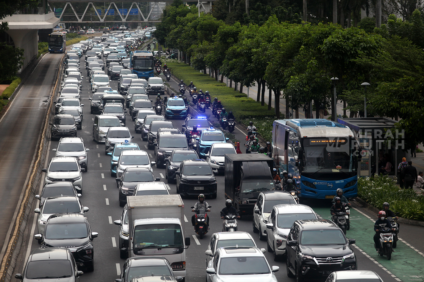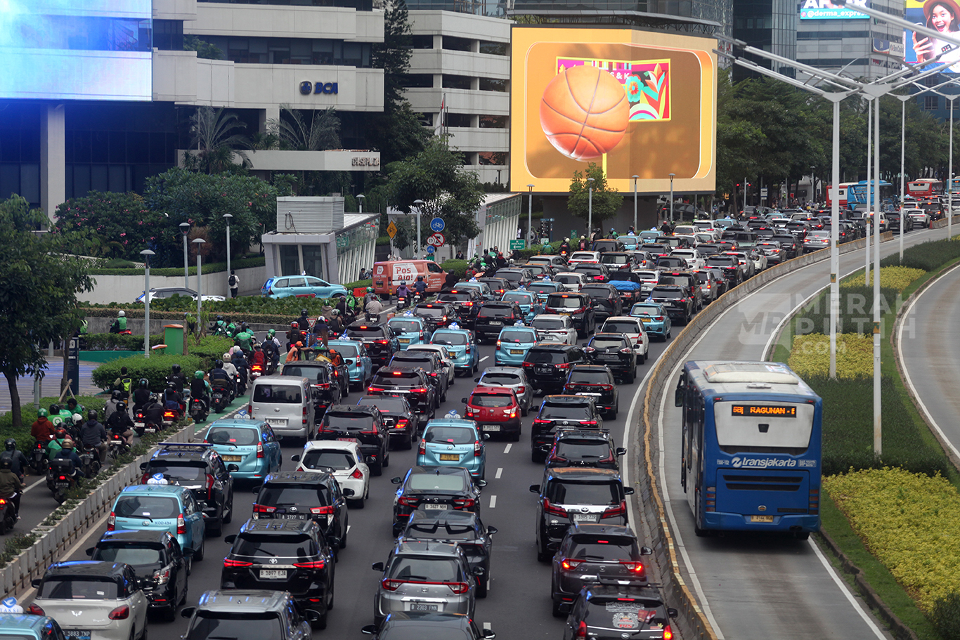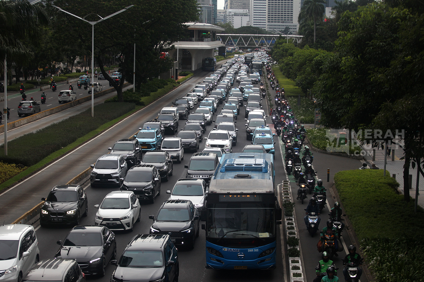 Merahputih.com - Suasana kemacetan lalu-lintas di Jalan Sudirman-Thamrin, Jakarta, Senin (25/11/2024).