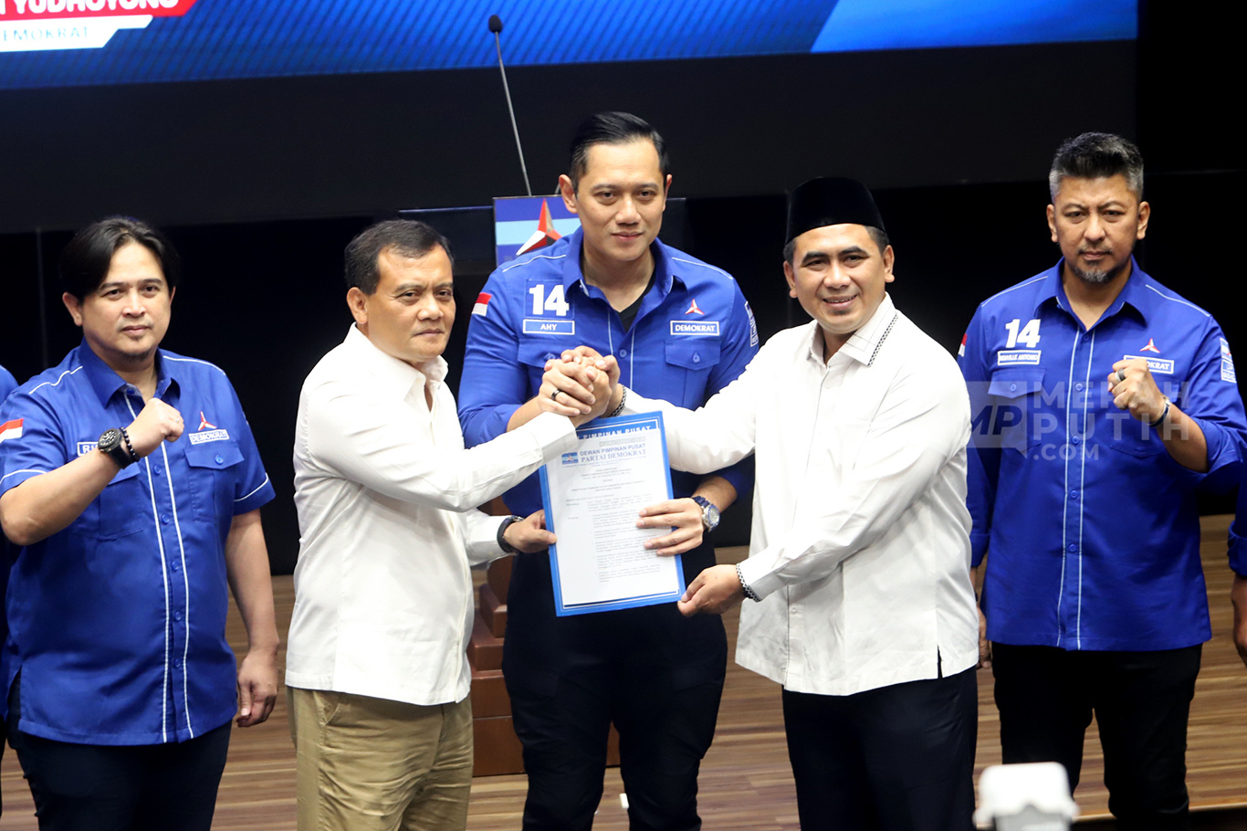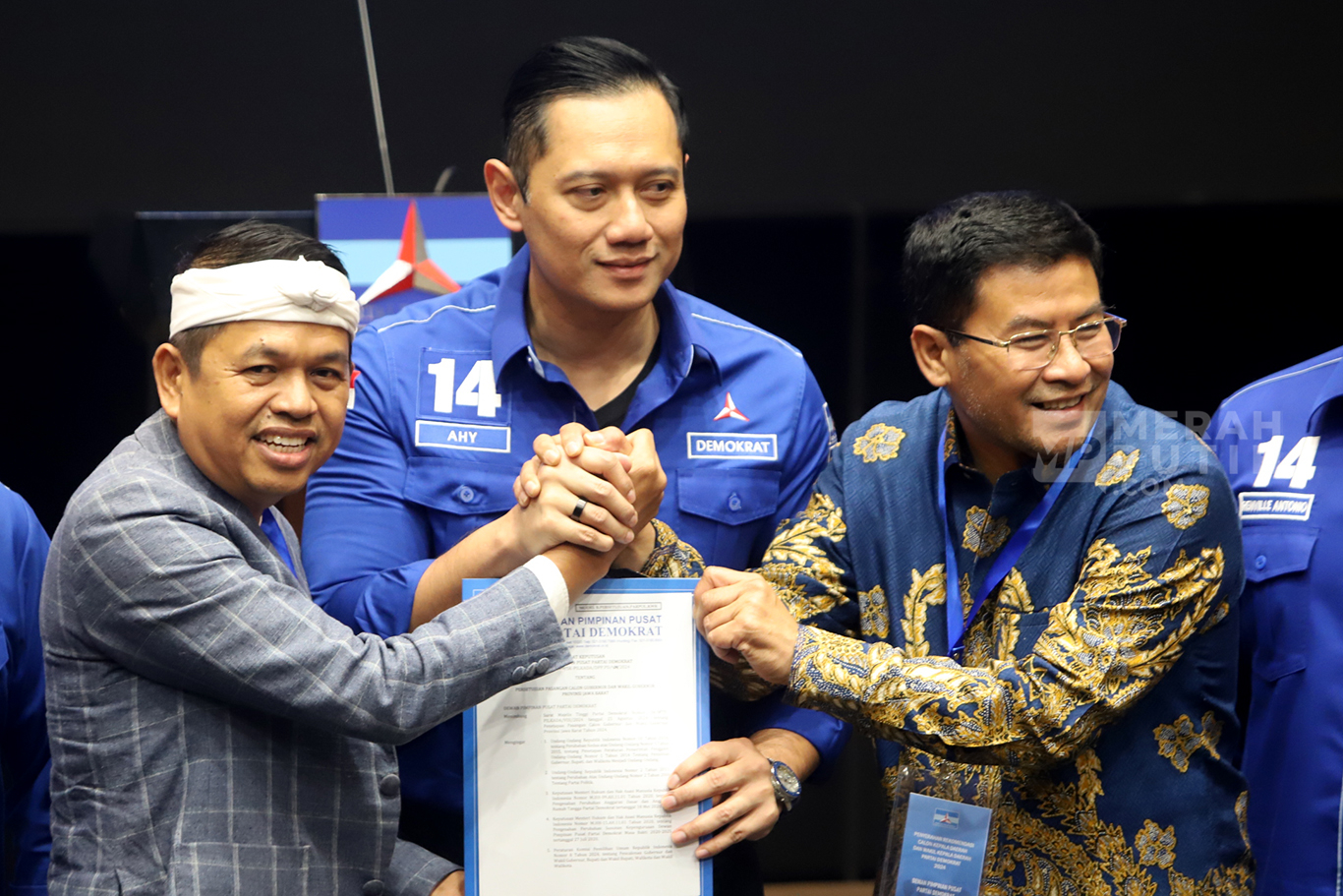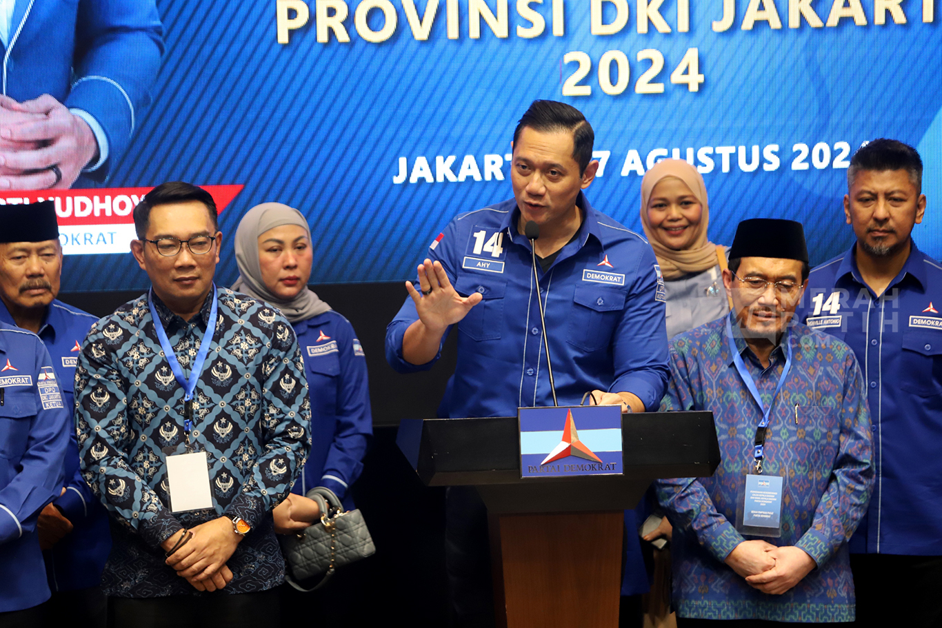Ketua Umum Partai Demokrat Agus Harimurti Yudhoyono (AHY) menyerahkan surat rekomendasi kepada 3 pasangan calon dalam Pilkada 2024 diantaranya pasangan bakal calon gubernur dan wakil gubernur Jakarta, Ridwan Kamil-Suswono, dan pasangan calon gubernur dan wakil gubernur Jawa Tengah, Ahmad Luthi-Taj Yasin, serta pasangan bakal calon gubernur dan wakil gubernur Jawa Barat, Dedi Mulyadi-Erwan Setiawan. (MP/Didik Setiawan).