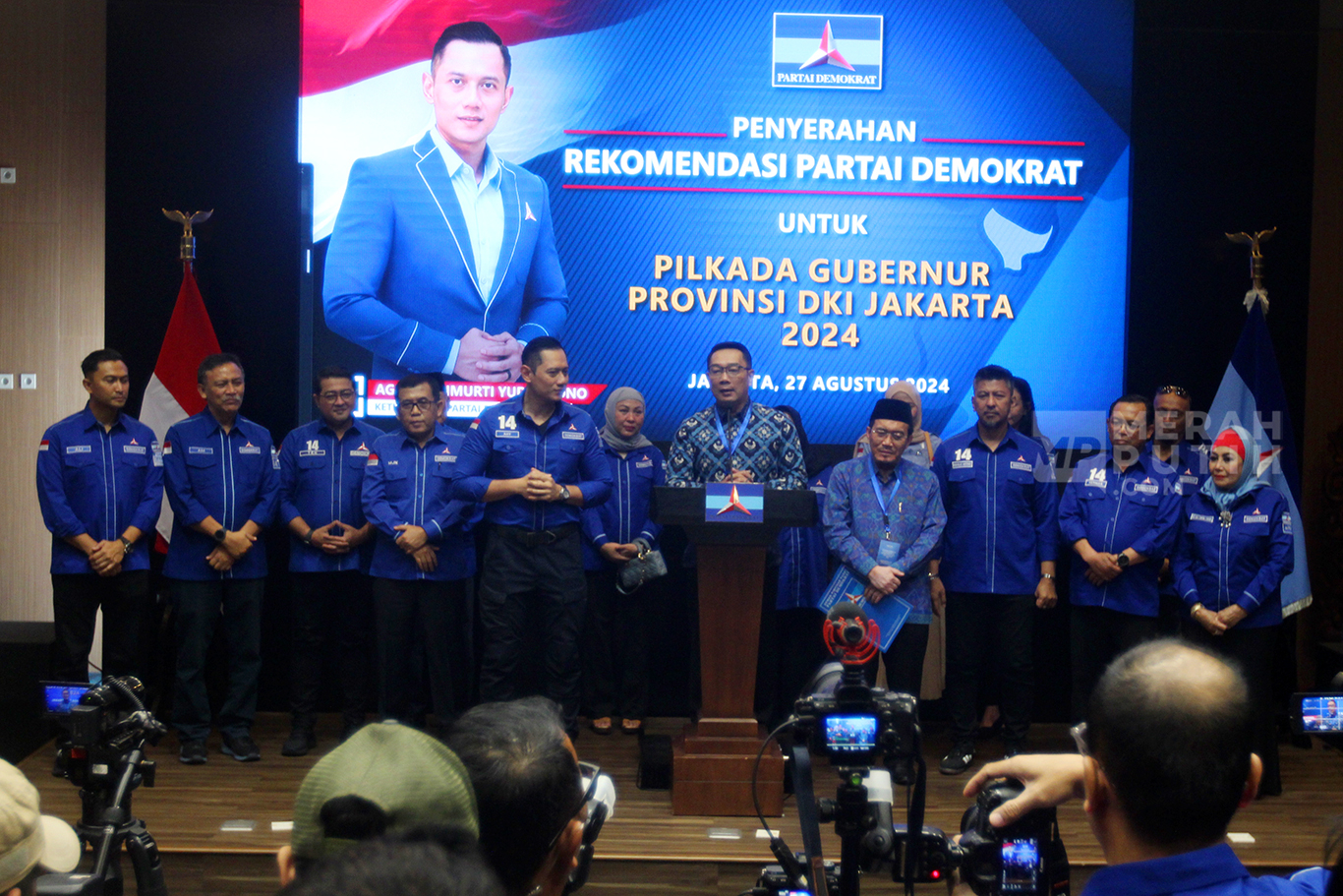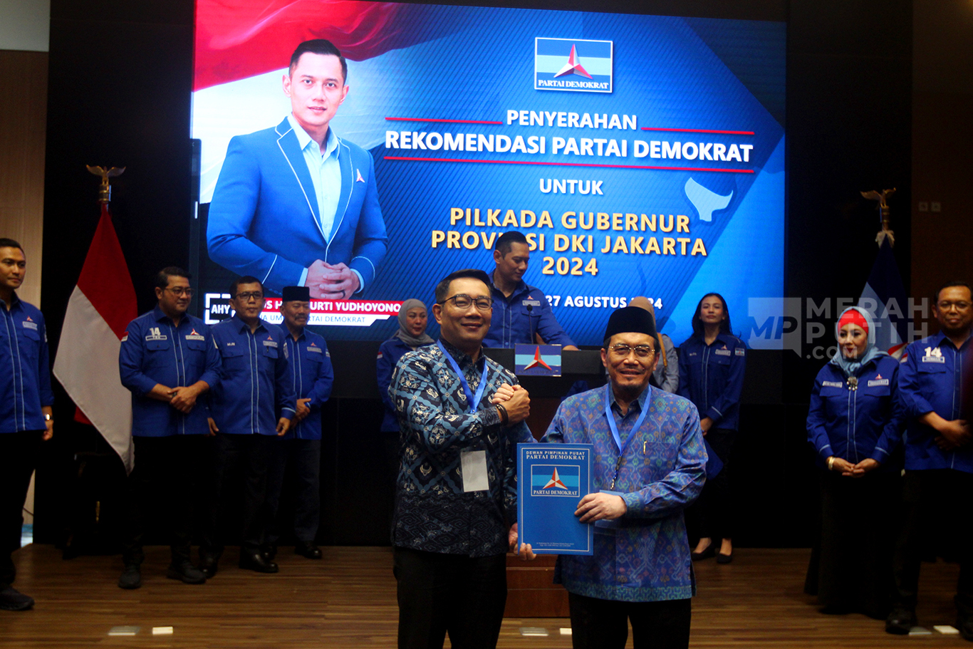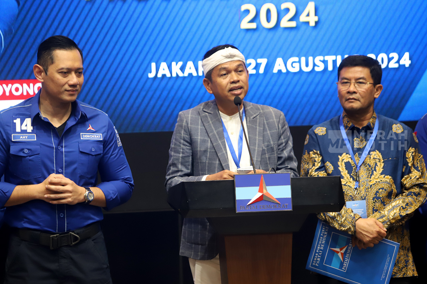 Ketua Umum Partai Demokrat Agus Harimurti Yudhoyono (AHY) menyerahkan surat rekomendasi kepada 3 pasangan calon dalam Pilkada 2024 diantaranya pasangan bakal calon gubernur dan wakil gubernur Jakarta, Ridwan Kamil-Suswono, dan pasangan calon gubernur dan wakil gubernur Jawa Tengah, Ahmad Luthi-Taj Yasin, serta pasangan bakal calon gubernur dan wakil gubernur Jawa Barat, Dedi Mulyadi-Erwan Setiawan. (MP/Didik Setiawan).