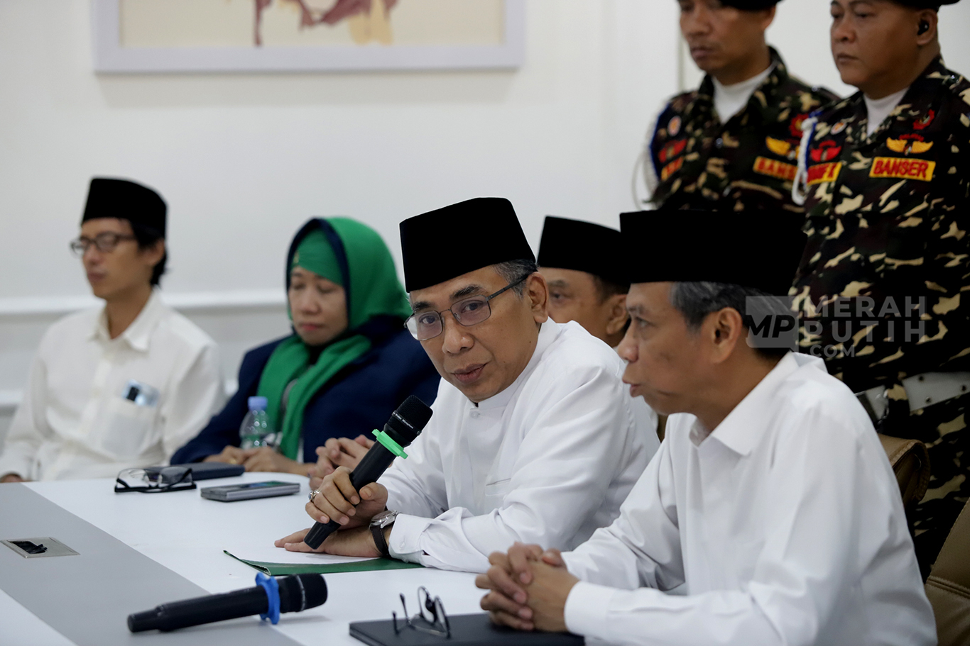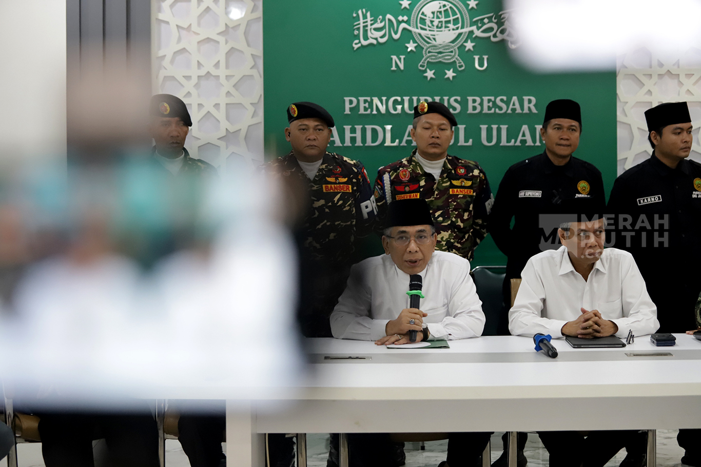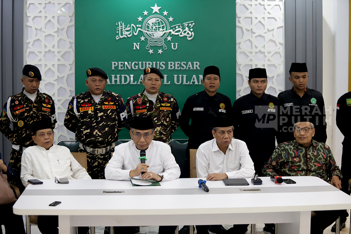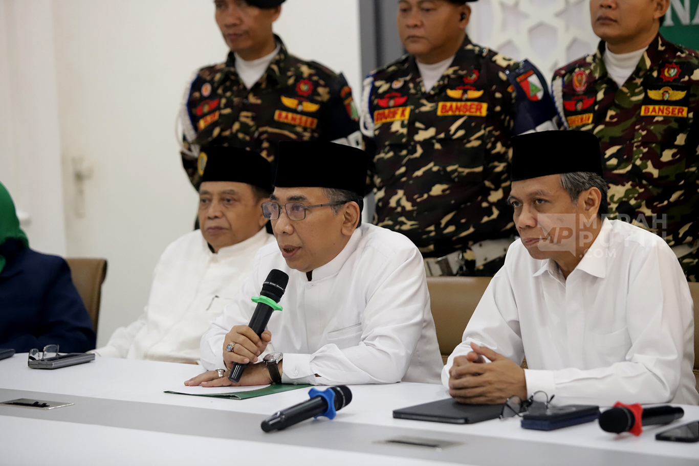 Gus Yahya mengajak seluruh pengurus NU di semua tingkatan untuk bersama-sama menyiapkan Muktamar ke-35 NU secara sah, bermartabat, dan sesuai dengan Anggaran Dasar dan Anggaran Rumah Tangga (AD/ART). Ajakan tersebut disampaikan Gus Yahya saat membacakan Surat Pernyataan Nomor: 4937/PB.23/A.II.07.08/99/12/2025 tentang Tanggapan atas Tabayun Rais Aam: Menjernihkan Masalah, Menatap Masa Depan. (Foto: MP/Didik Setiawan).