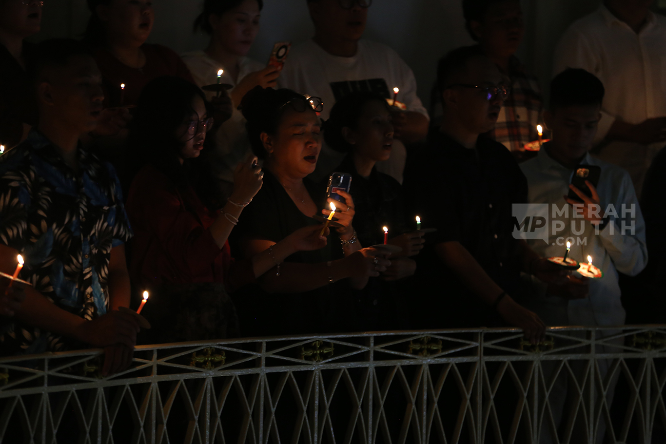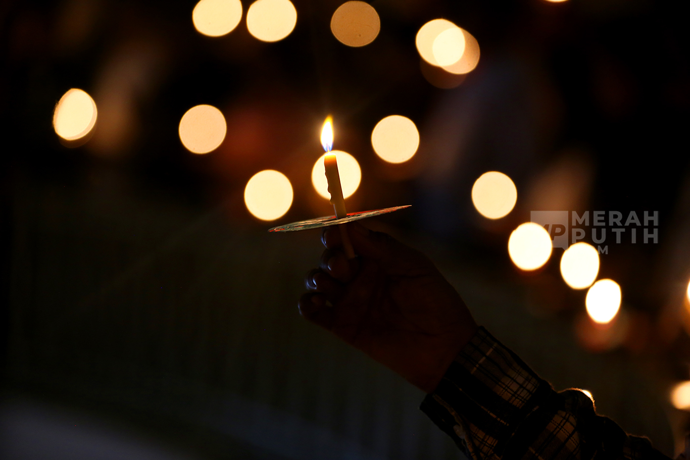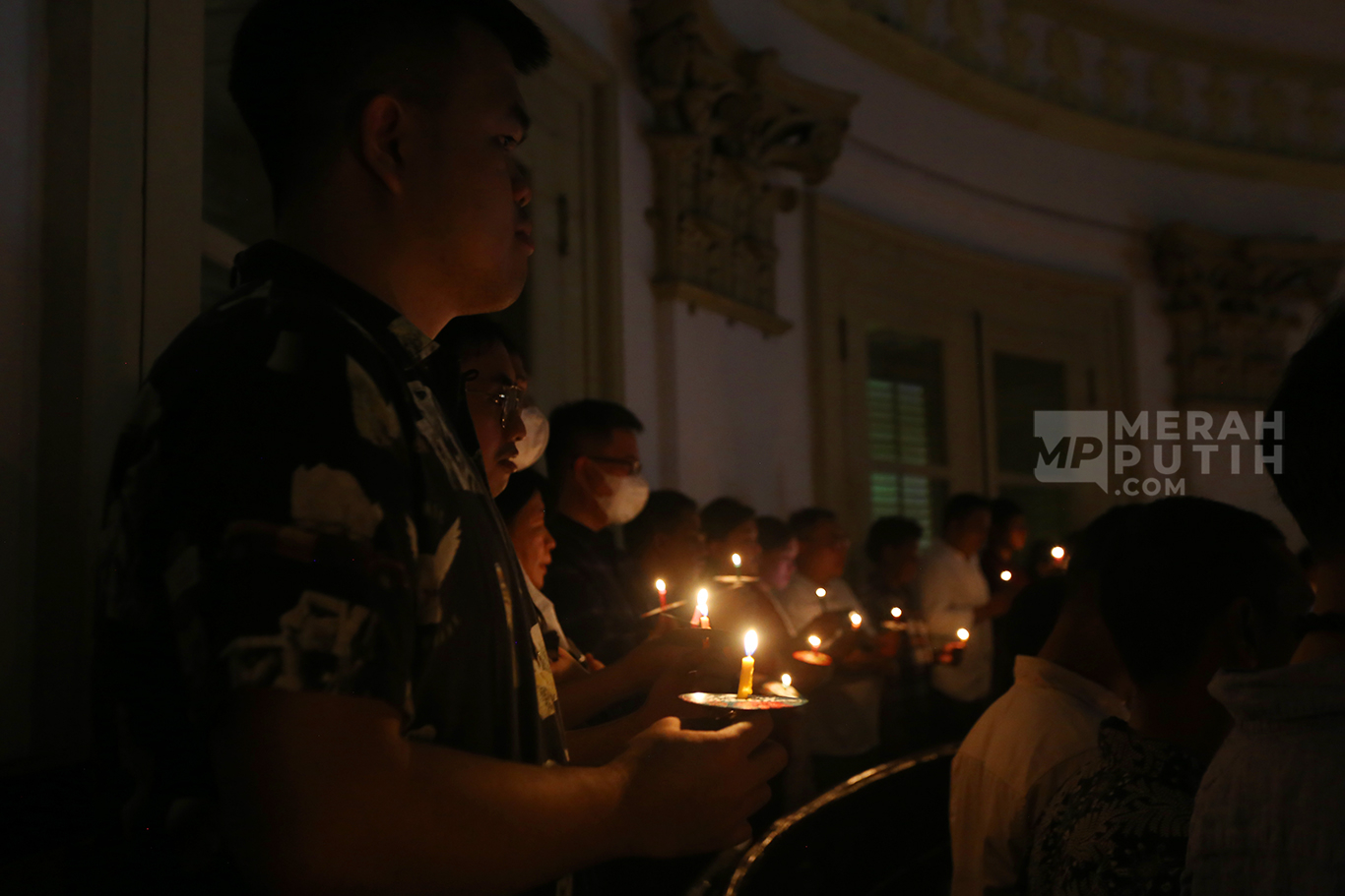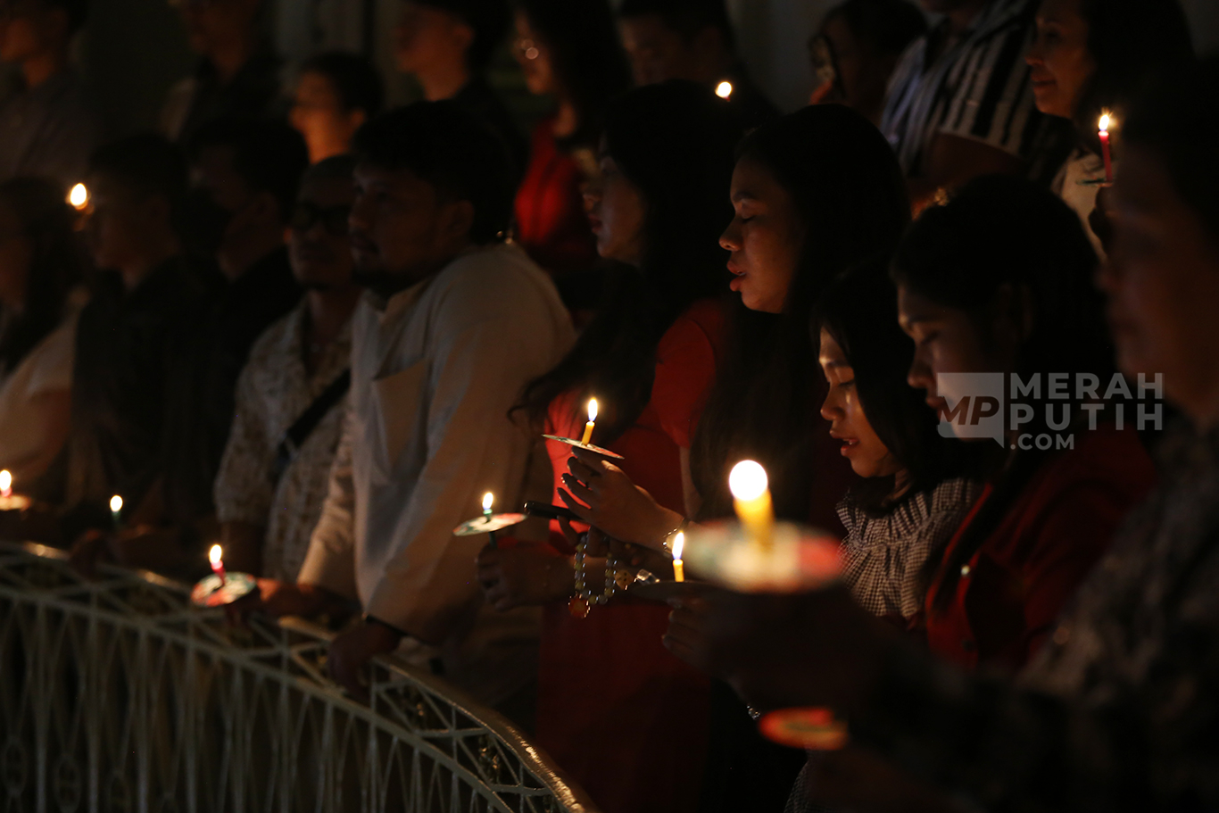 Merahputih.com - Jemaat umat Kristiani menyalakan lilin saat melaksanakan ibadah malam Natal di GPIB Immanuel, Gambir Jakarta Pusat, Rabu (24/12/2025).