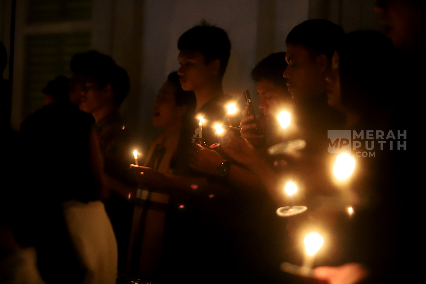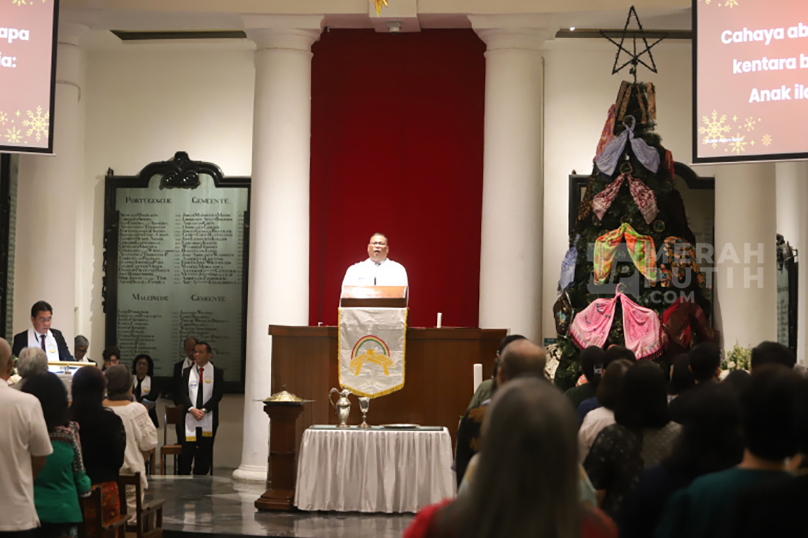 Merahputih.com - Jemaat melaksanakan ibadah Natal di GPIB Immanuel, Jakarta Pusat, Rabu (25/12/2024). Gereja Protestan Indonesia Bagian Barat (GPIB) Immanuel Jakarta menggelar ibadah Natal 2024 dengan tema Kesederhanaan Natal Kristus Membawa Kesukacitaan Besar Bagi Dunia.