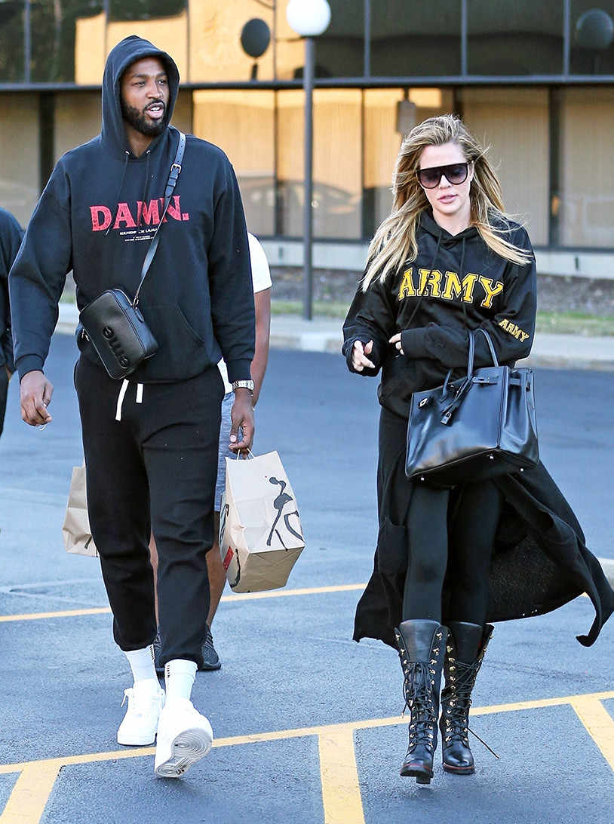 Anggota Kardashian itu terlihat mengenakan hoodie hitam bertulisan 'Army' dengan bawahan legging dan sepatu boots hitam tinggi. Sementara Tristan mengenakan hoodie hitam bertulisan 'DAMN'. Tangan pemain basket Cleveland Cavaliers itu mengenggam tas belanjaan.