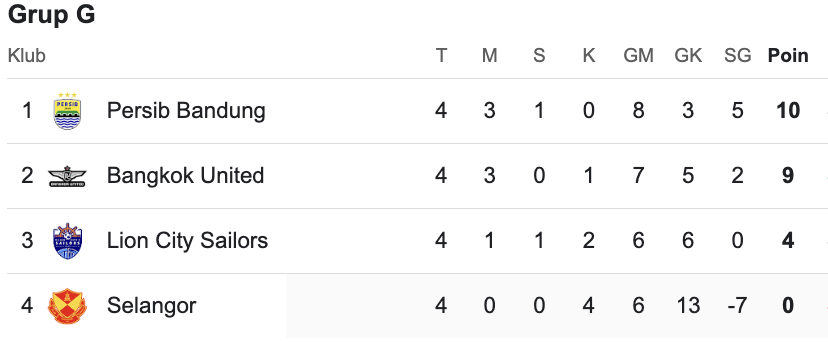 Posisi ketiga diisi Lion City Sailors dengan empat poin. Sedangkan Selangor masih terpaku di dasar tanpa poin.