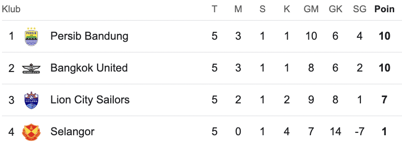 Persib ada di puncak dengan 10 poin dari lima laga yang dijalani. Sementara itu, tambahan tiga poin membuat Lion City Sailors mengoleksi 7 angka sekaligus menjaga peluang lolos.