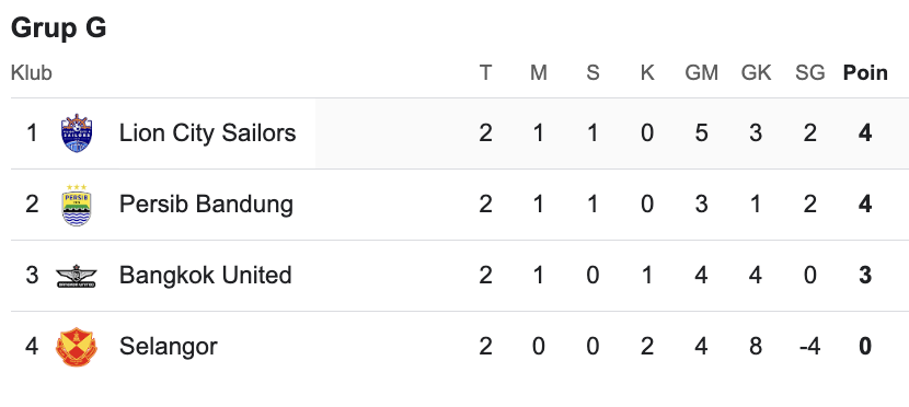Jumlah poin Persib Bandung sama dengan Lion City Sailors yang ada di tempat pertama. Sailors, wakil Singapura meraih kemenangan di matchday kedua dengan skor 4-2 kala menjamu klub Malaysia Selangor FC.