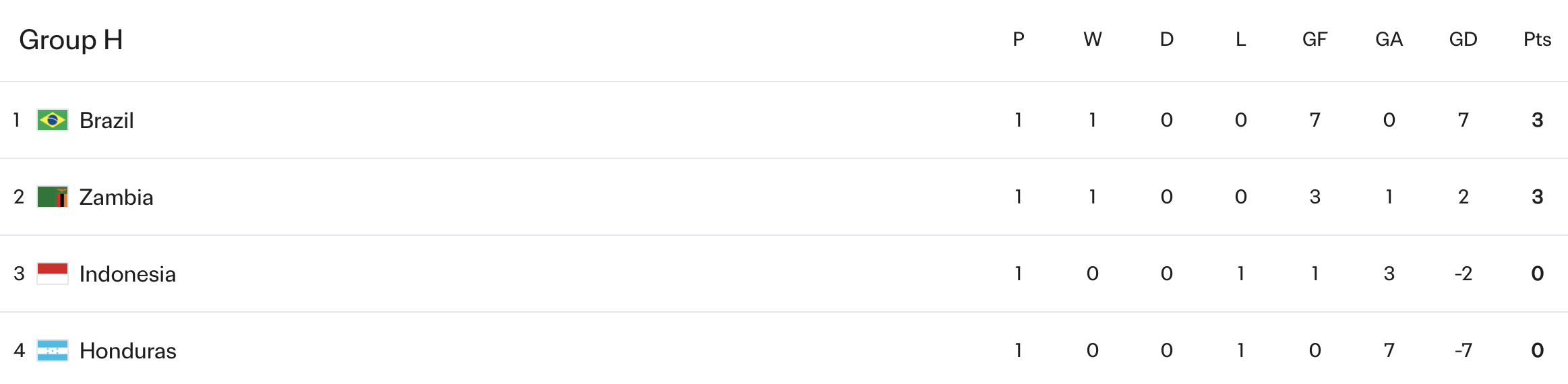 Brasil mengantongi 3 poin dengan keunggulan selisih gol darin Zambia. Adapun Honduras harus puas berada di dasar Grup H tanpa poin.