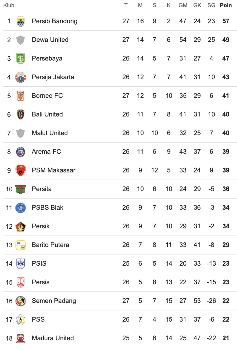 Tambahan tiga poin membuat Persib mengoleksi 57 angka. Jumlah poin menjadi berselisih delapan dari Dewa United FC, peringkat kedua sementara.