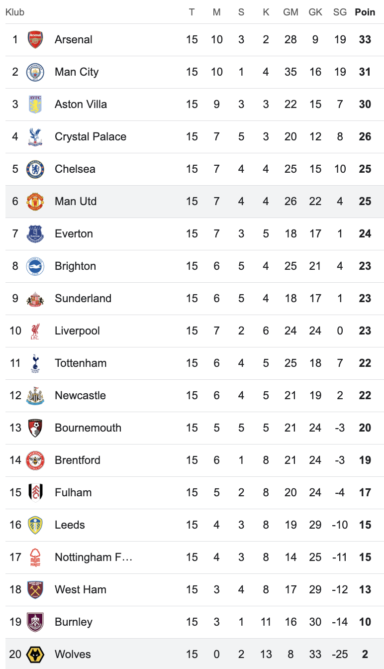 Klasemen Liga Inggris Premier League 2025/2026