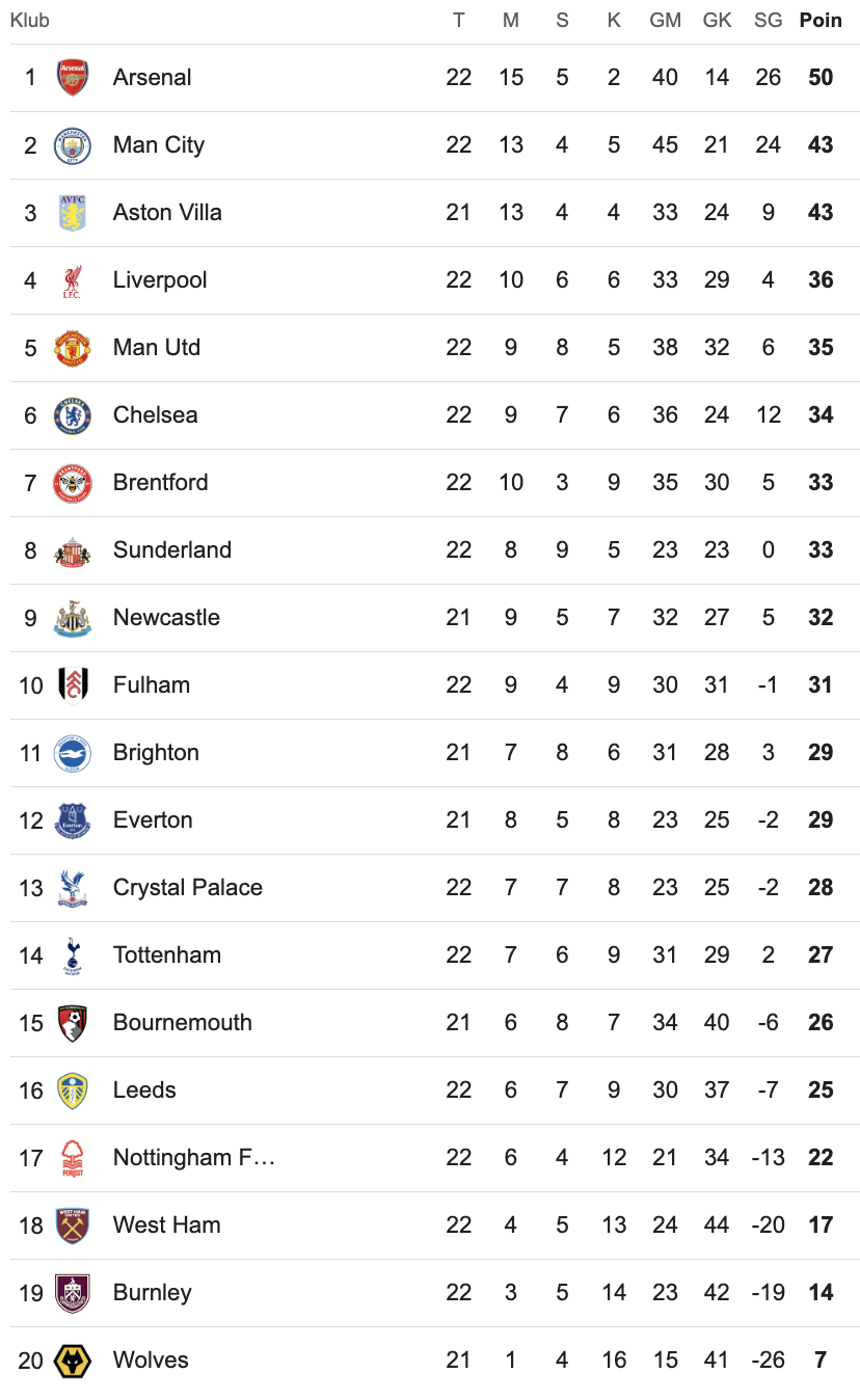 Klasemen Liga Inggris Premier League