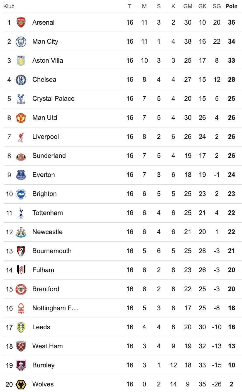 Klasemen hingga pekan 16 masih dipimpin oleh Arsenal, diikuti Manchester City, Aston Villa, dan Chelsea.