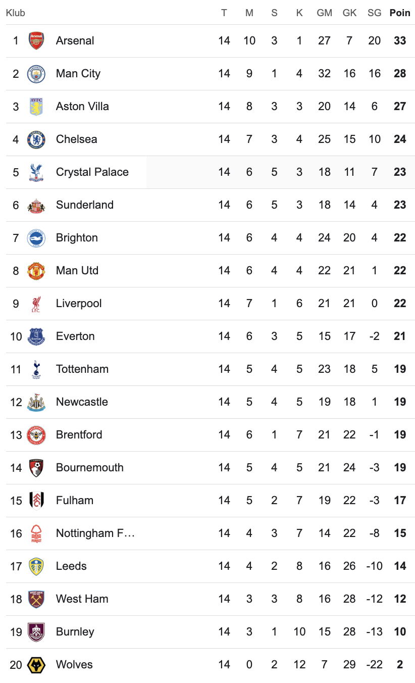 Klasemen Liga Inggris Premier League. (Tangkapan Layar Google)