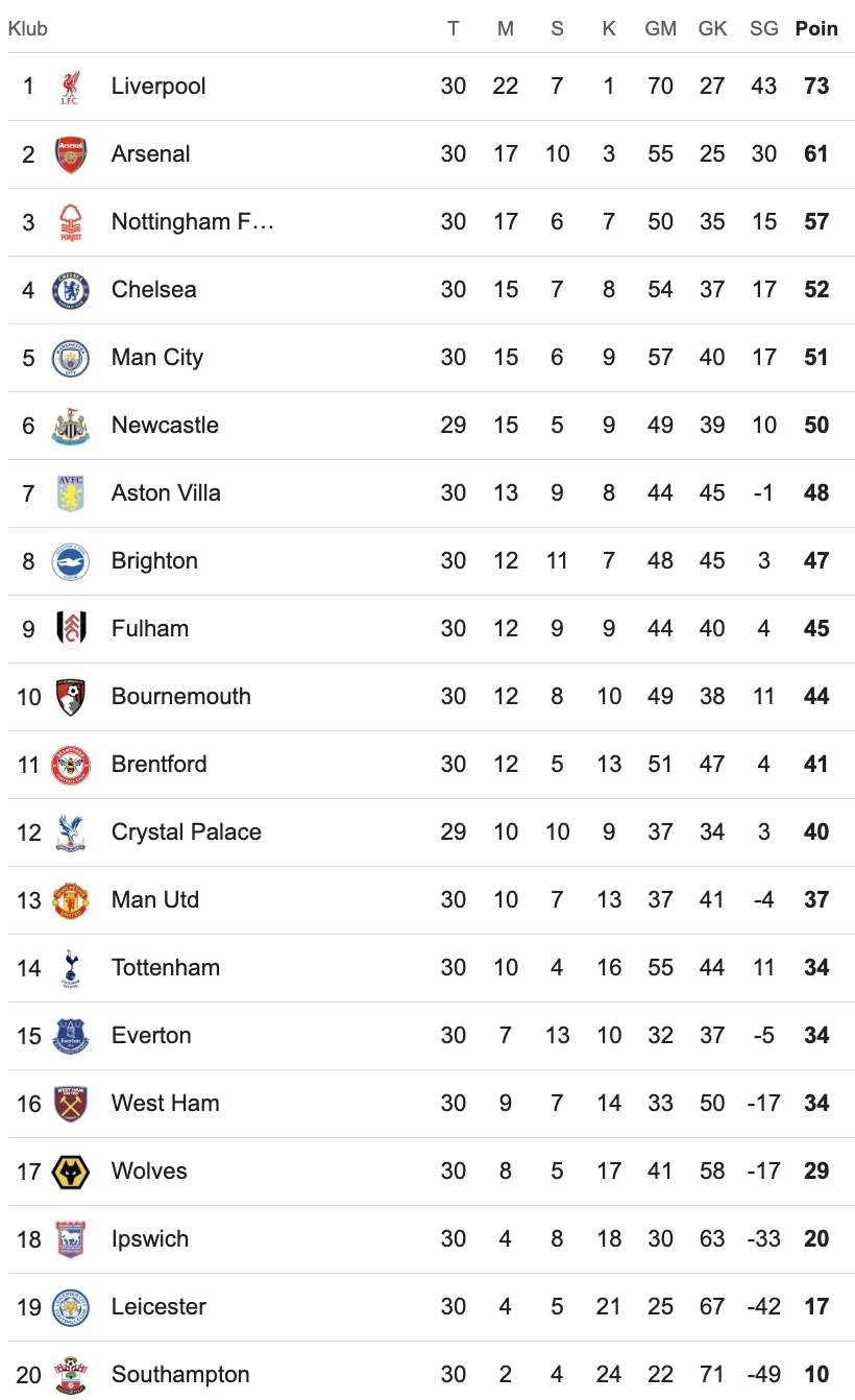 Berikut klasemen Liga Inggris