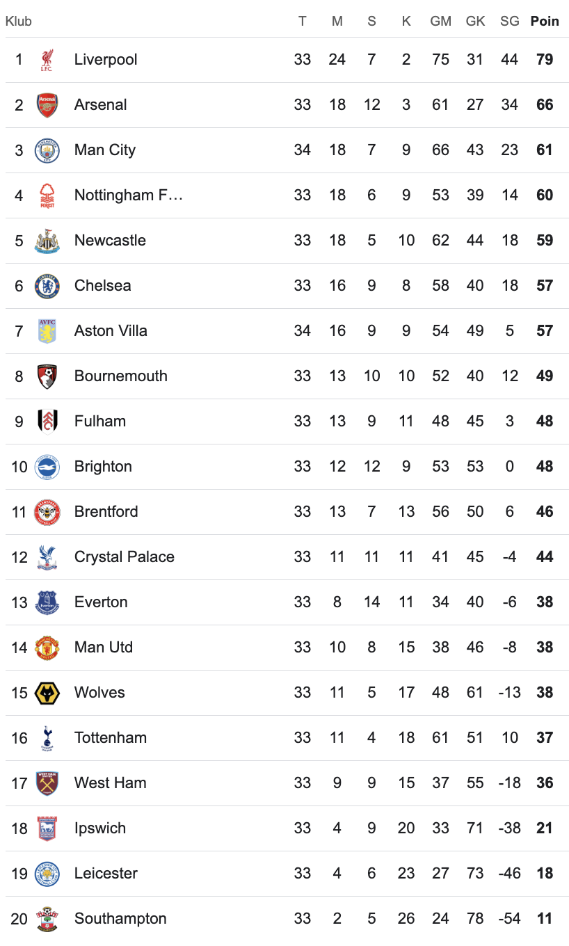 Berikut klasemen Liga Inggris