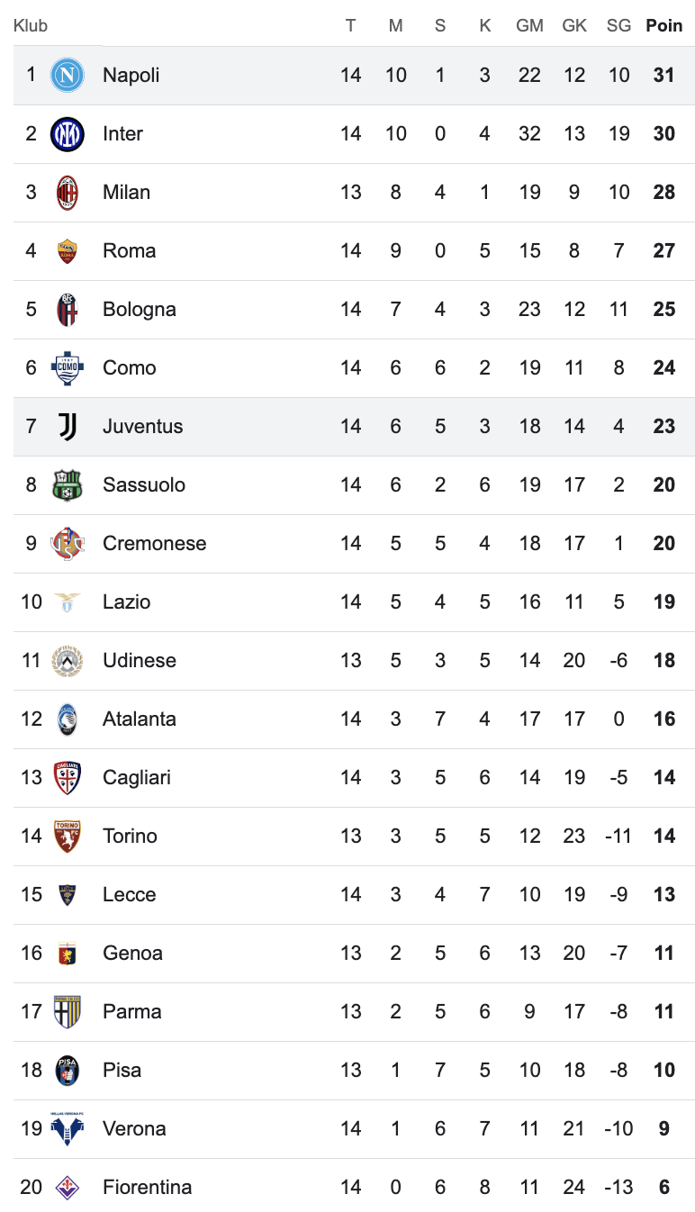Klasemen Liga Italia Serie A 2025/2026 Setelah Napoli Tundukkan Juventus 2-1