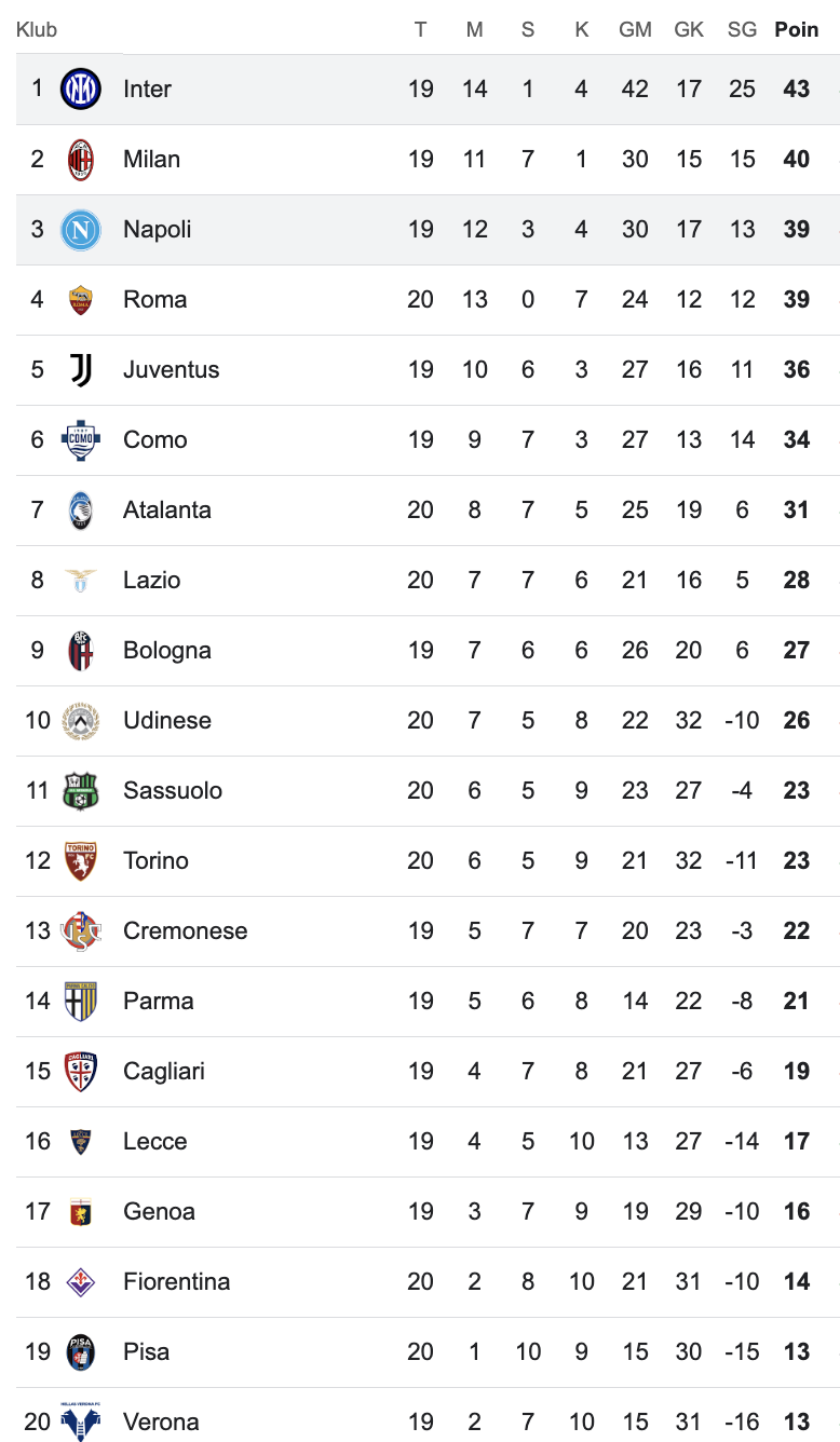 Klasemen Liga Italia Serie A Setelah Inter Milan Menang 2-0 atas Parma, Sementara Napoli Bermain 2-2 dengan Verona