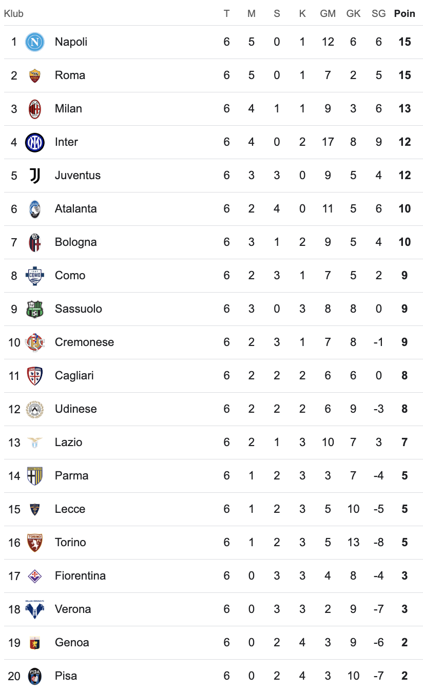 Sementara itu, dasar klasemen diisi Pisa dengan dua poin, jumlah yang sama yang dimiliki Genoa.