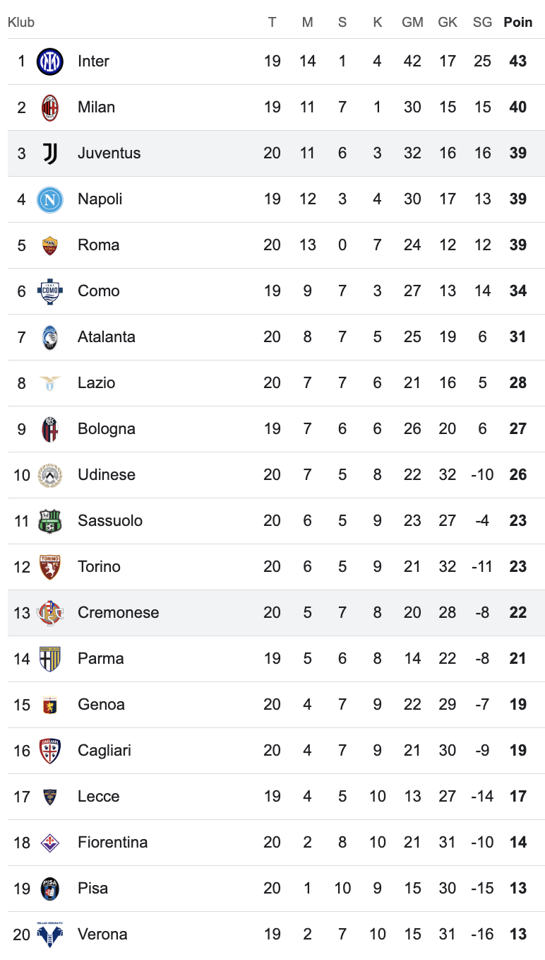 Juventus saat ini berada di posisi 3 dengan 39 poin. Berselisih empat dari pemuncak klasemen Inter Milan dan satu angka dari AC Milan yang berada di posisi 2.