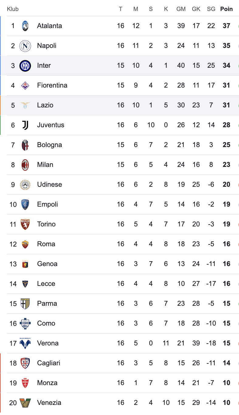 Sementara itu, Lazio berada di posisi kelima dengan 31 poin. Dasar klasemen diisi Venezia dengan 10 angka.