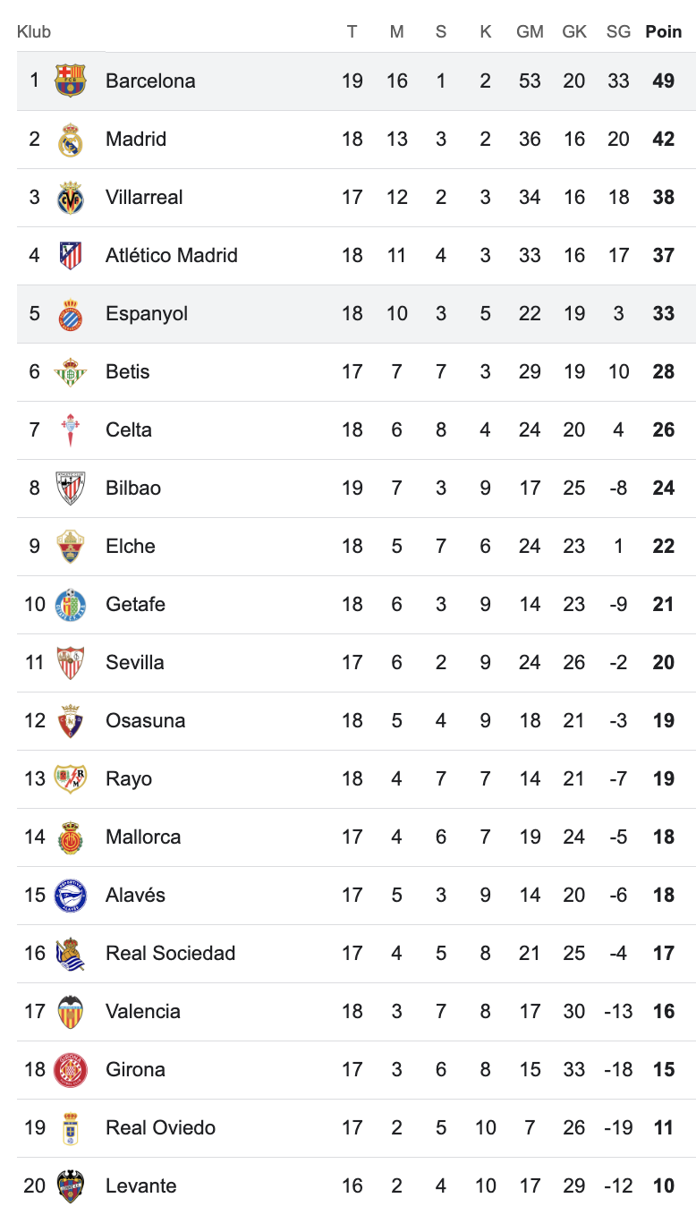 Jumlah poin berselisih tujuh dari Real Madrid yang berada di posisi kedua. Real Madrid baru memainkan laga pekan ke-19 melawan Real Betis, Minggu (4/1) malam WIB.