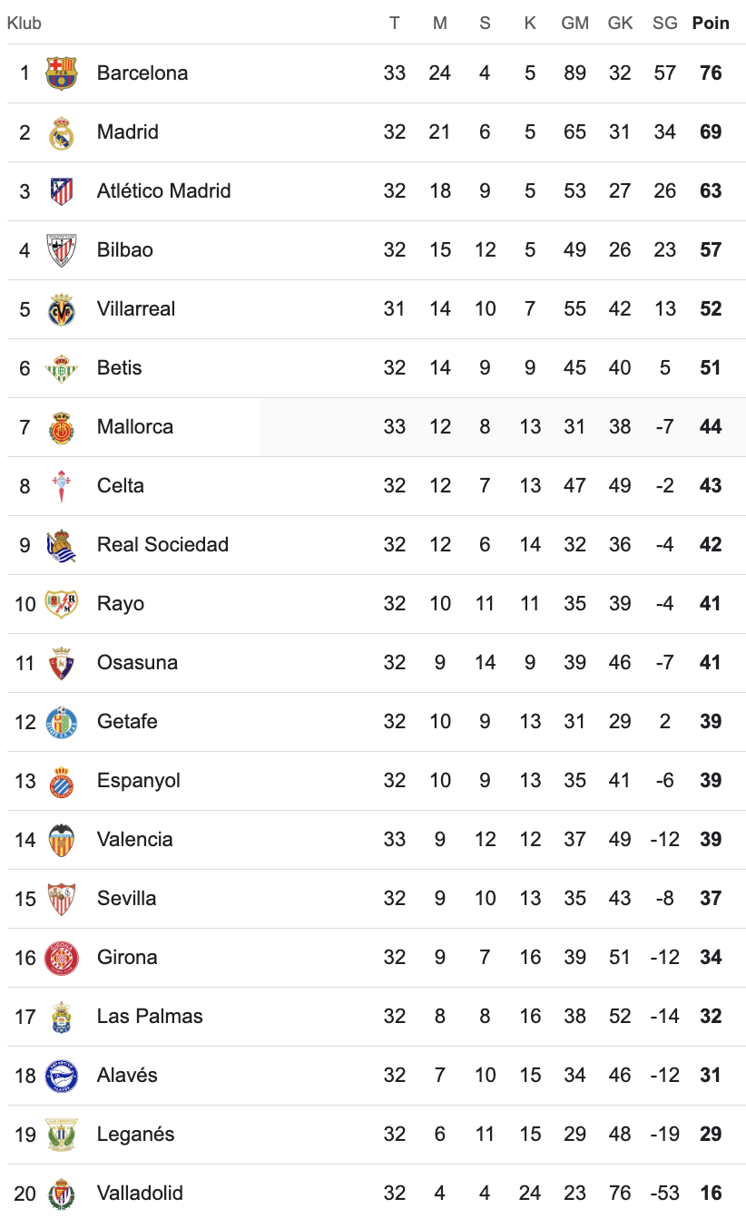 Berikut klasemen Liga Spanyol