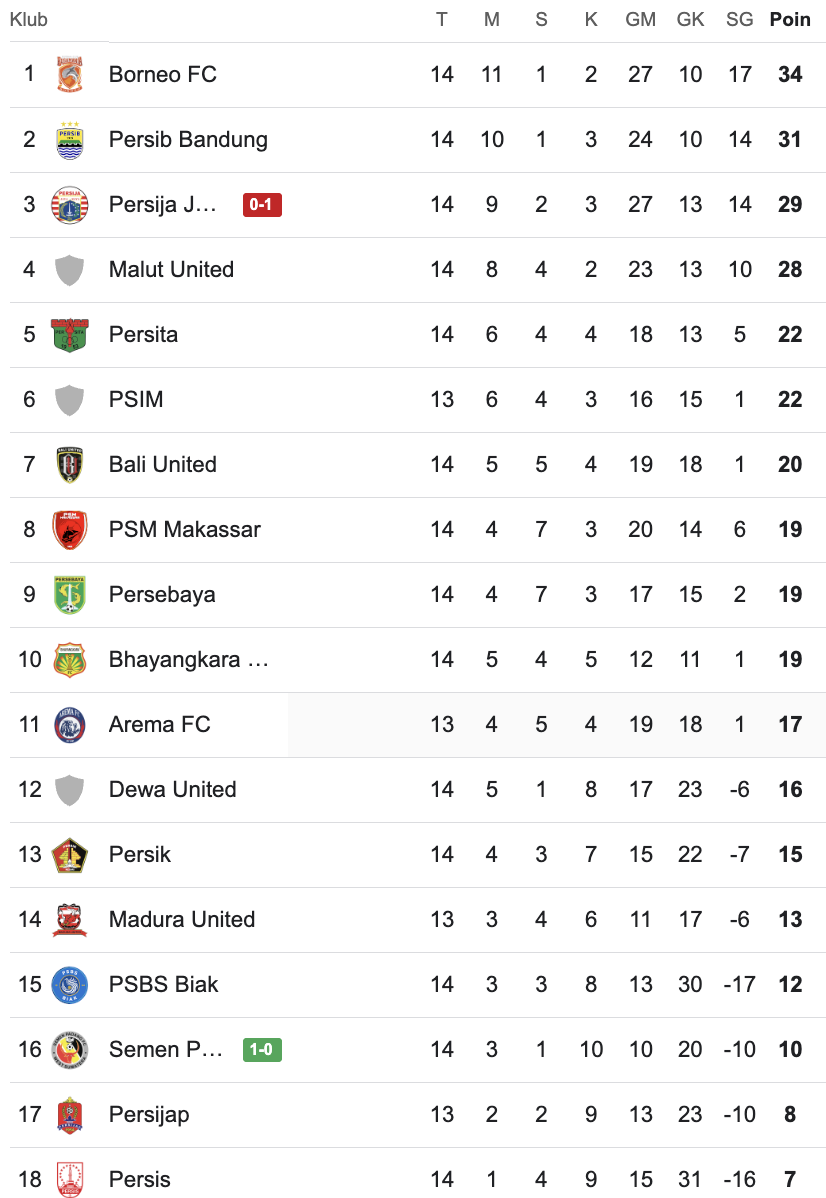 Adapun tambahan tiga angka membuat Semen Padang naik ke posisi 16 dengan 10 angka.