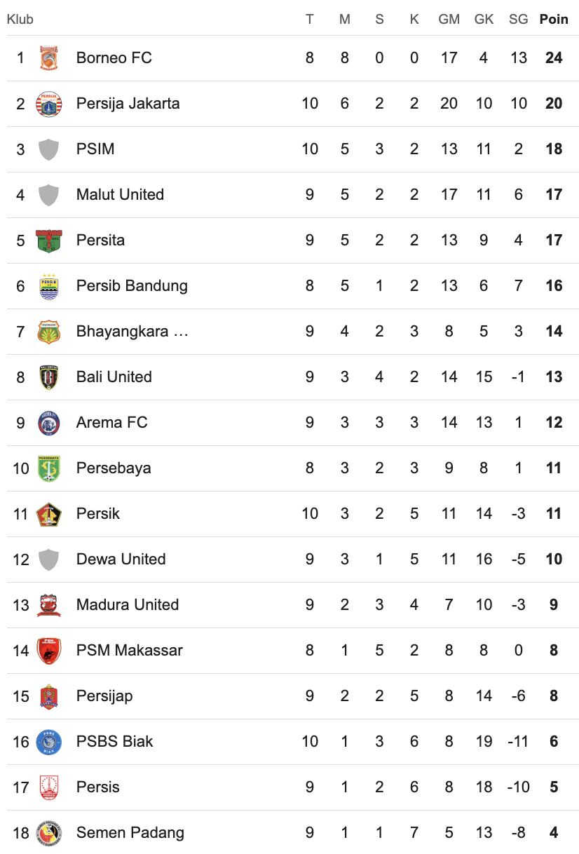 Jumlah poin Persija berselisih empat dari pemuncak klasemen Borneo FC, yang baru memainkan delapan laga.