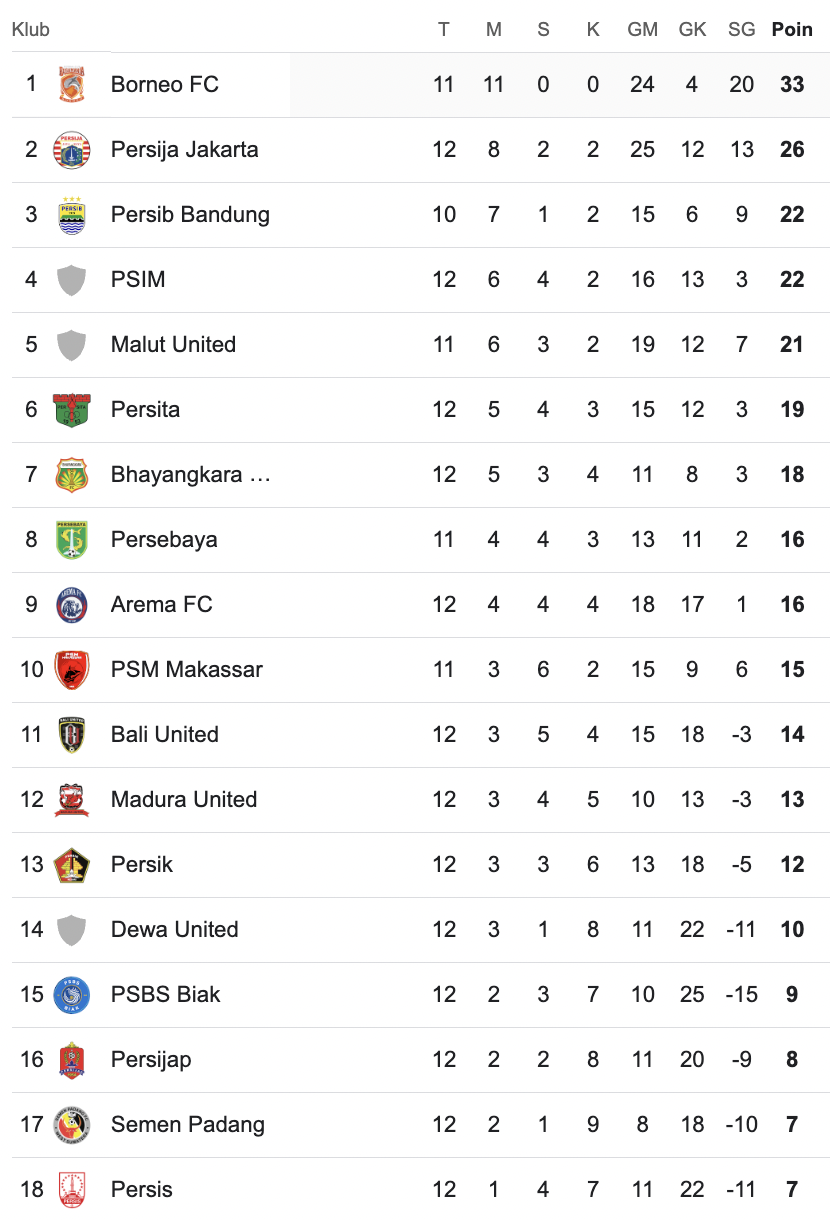 Klasemen Super League 2025/2026 Setelah Pekan 13: Borneo FC Masih Mantap di Puncak, Persis Solo Kini di Dasar
