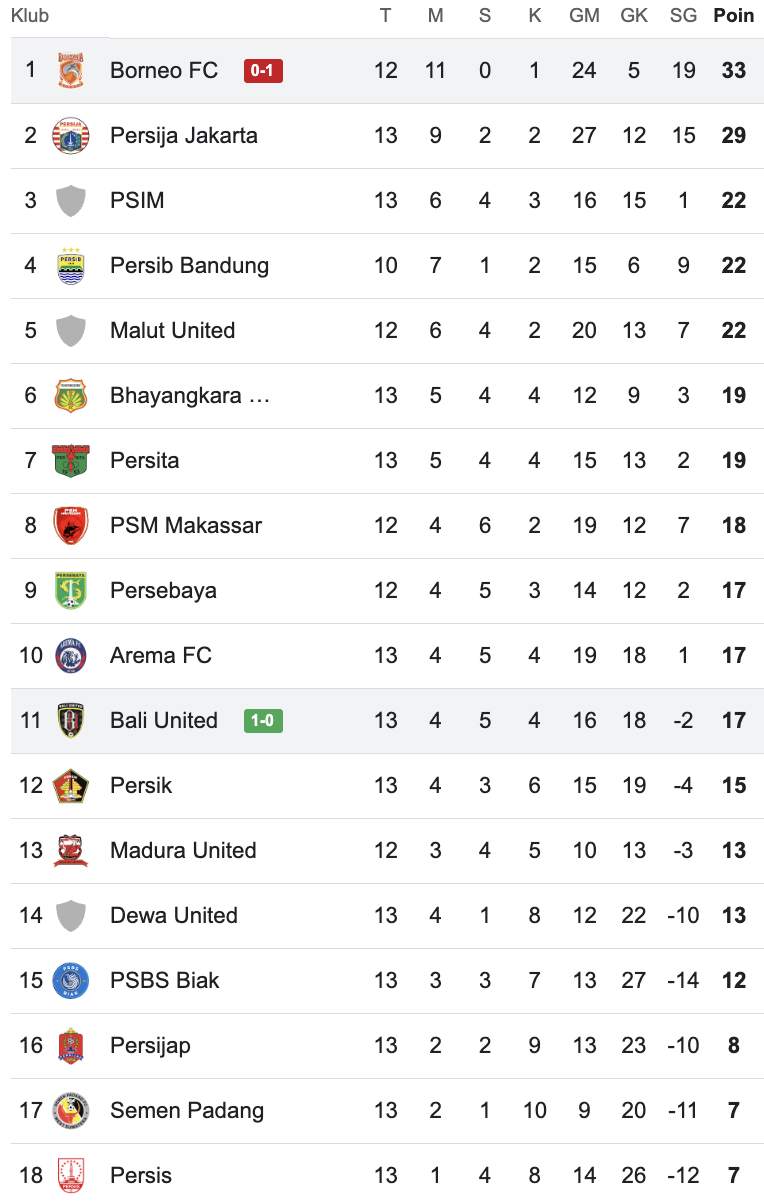 Hasil ini membuat Borneo FC tetap dengan 33 poin dari 12 pertandingan. Berselisih empat angka dari Persija Jakarta, yang membuntuti di tempat kedua. Sementara kemenangan membuat Bali United memiliki 17 angka dari 13 laga.