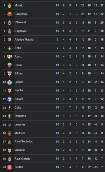 Dua posisi terbawah klasemen (zona degradasi) tetap diisi oleh Real Oviedo dan Girona, setelah keduanya bermain imbang dengan skor 3-3 di pekan kesepuluh.