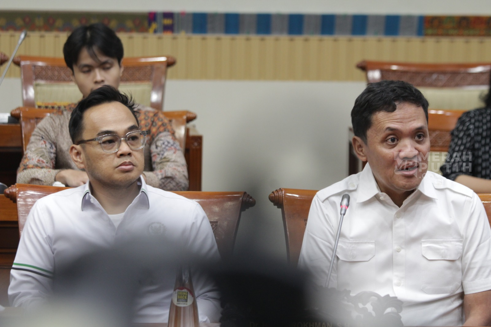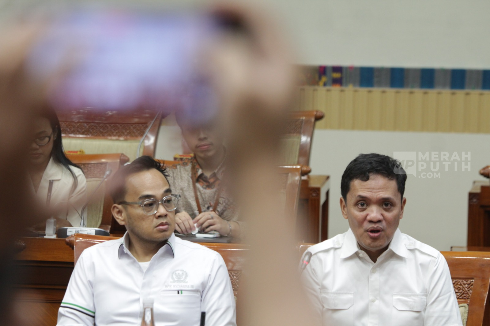 Ketua Komisi III DPR Fraksi Gerindra Habiburokhman (kanan) bersama Wakil Ketua Komisi III DPR Fraksi PKB Rano Alfath memberikan keterangan kepada Wartawan, di Ruang Komisi III DPR, Gedung Nusantara II Kompleks Parlemen Senayan, Jakarta, Jumat (29/11/2024).