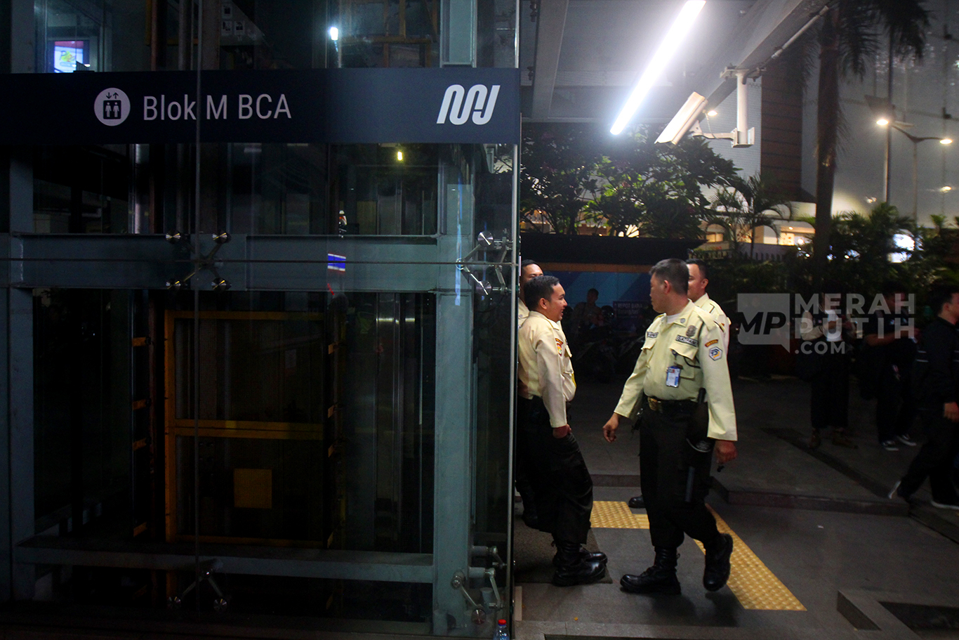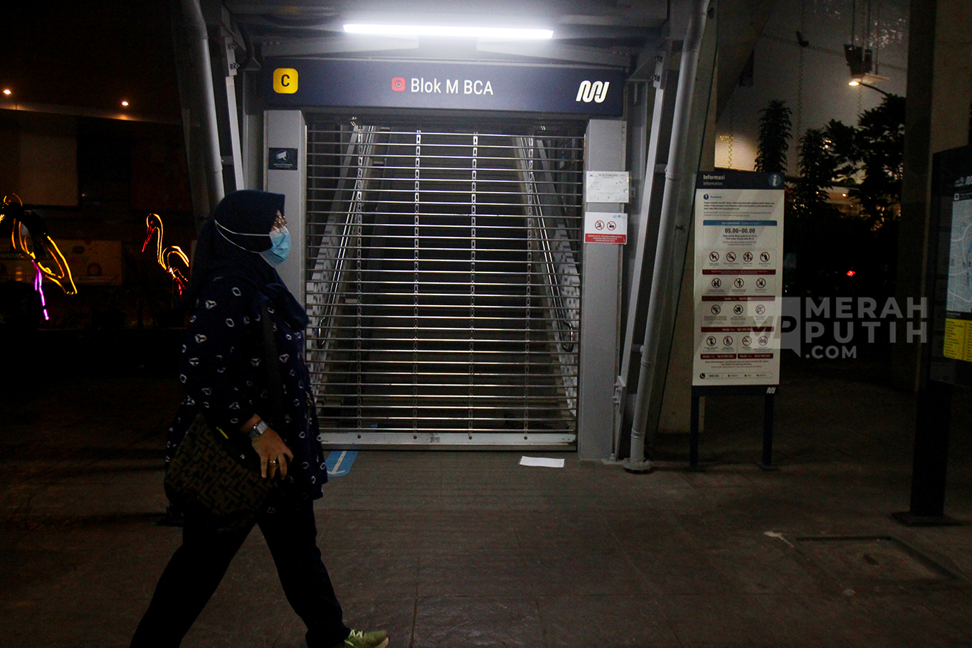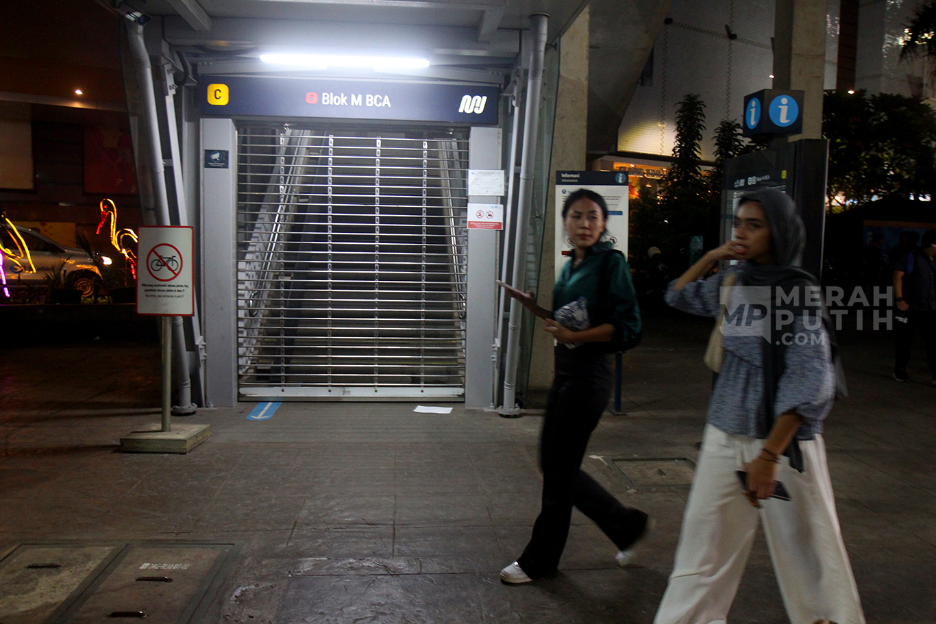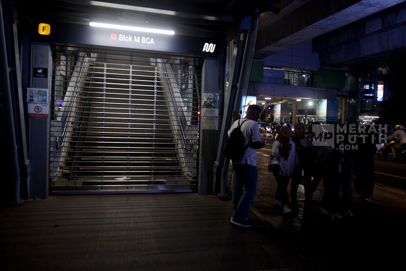 MerahPutih.com- Penumpang bertanya kepada petugas keamanan yang berjaga di pintu masuk Stasiun MRT Blok M saat ditutup usai insiden besi crane jatuh di jalur MRT Jakarta depan Gedung Kejasaan Agung, Kamis (30/5/2024) Sore.