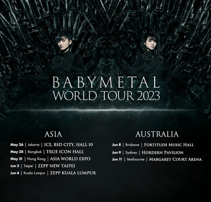 Mereka menggelar konser bernama 'Baby Metal World Tour 2023 in Jakarta' pada 26 Mei 2023 di ICE BSD City Hall 10. Selain Indonesia, Baby Metal juga akan menggelar tur mereka di Bangkok, Hong Kong, Taipei, dan Kuala Lumpur. Sedangkan di Australia, band yang aktif di industri musik pada 2010 ini akan mengunjungi tiga kota besar di Negeri Kangguru. Mereka akan ke Brisbane pada 8 Juni, Sydney pada 9 Juni, dan Melbourne pada 11 Juni.