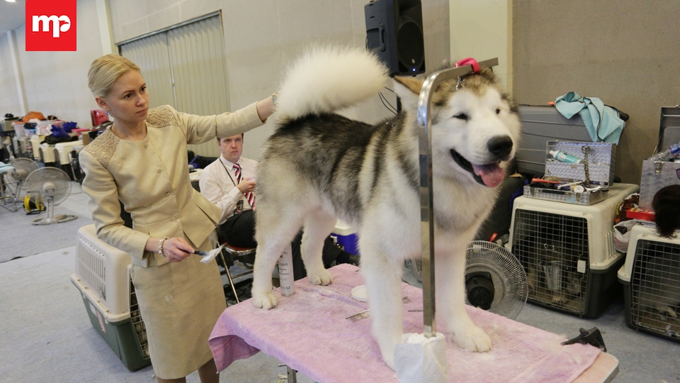 Seorang handler sedang mendandani seekor anjing Alaskan Malamute, sebelum tampil dalam kontes. Pada kontes tersebut tidak sedikit breeders (pembiak) yang menggunakan jasa handler dari luar negeri dengan biaya yang cukup besar.