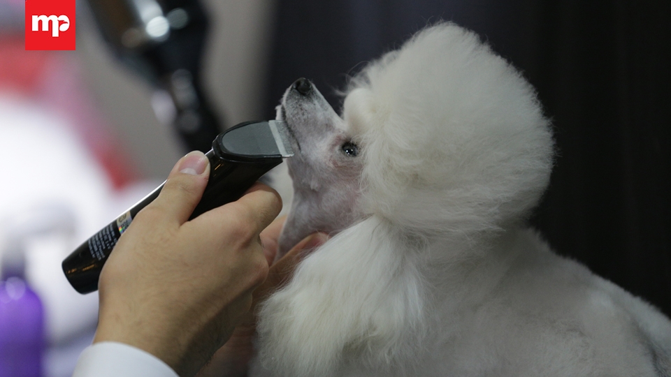 Menjelang kontes seekor anjing jenis Poodle tengah ditata bulunya oleh seorang handler di Ecopark Ancol, Jakarta.