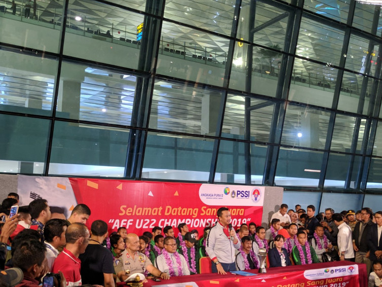 Saat tiba di Bandara Internasional Soekarno-Hatta, Rabu (27/2) malam, timnas U-22 sempat menerima kalungan bunga sesaat tiba di Tanah Air usai berlaga di Phnom Penh, Kamboja.