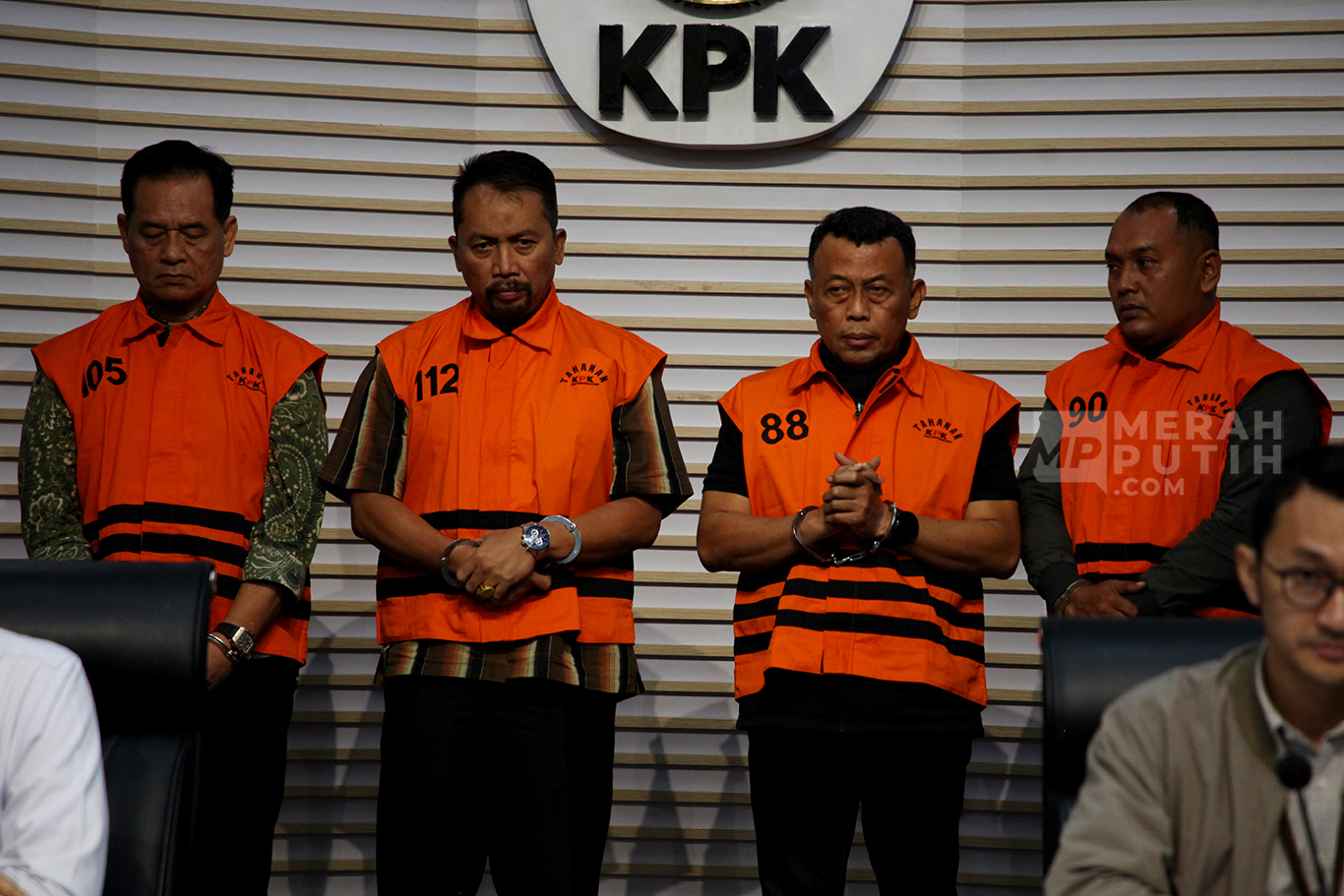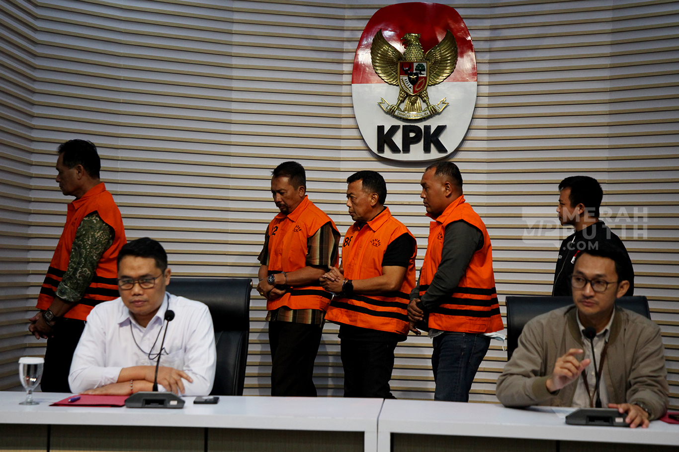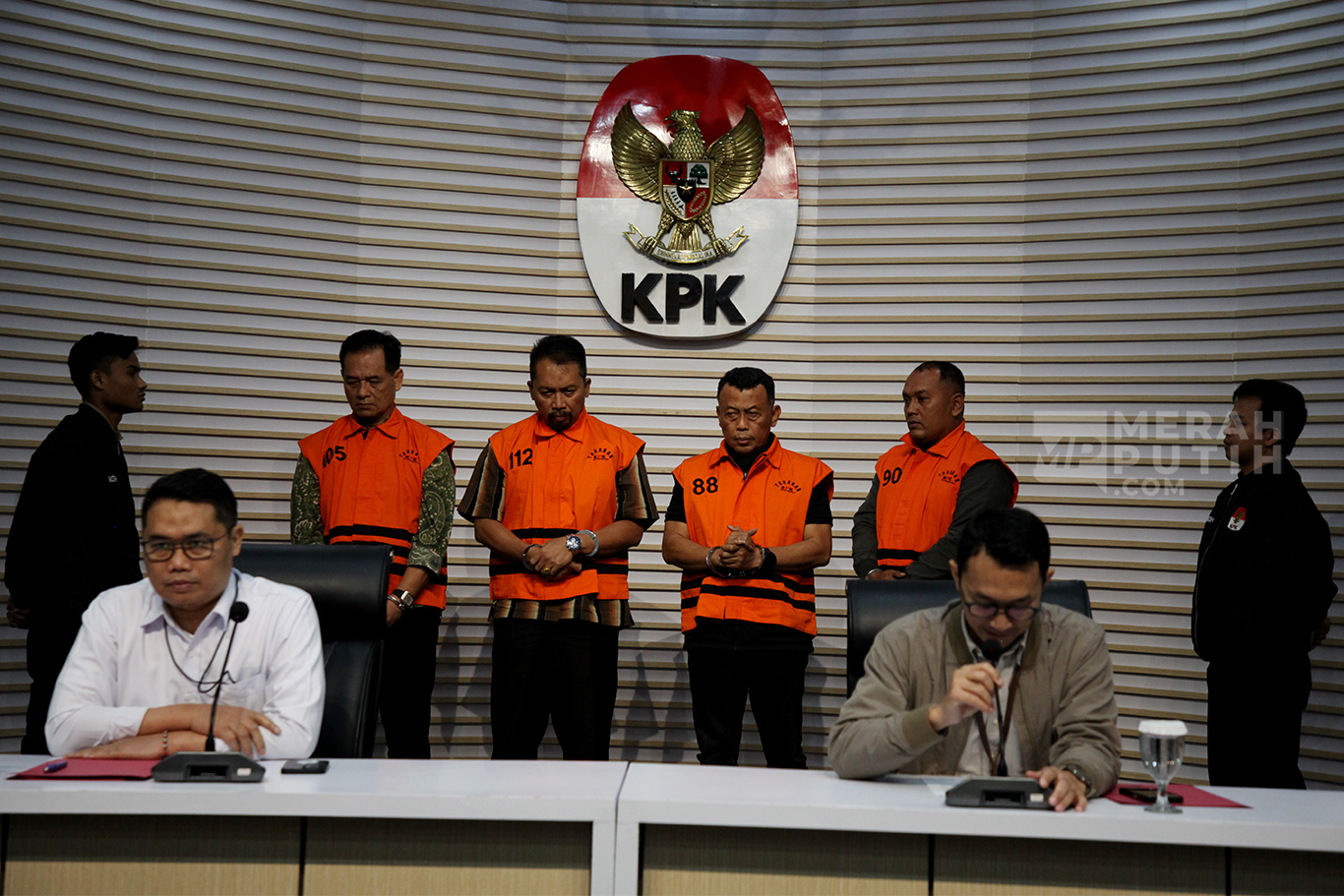 Merahputih.com - Tersangka dugaan Korupsi Jabatan RSUD, Bupati Ponorogo Sugiri Sancoko (kedua kanan), Sekretaris Daerah (Sekda) Kabupaten Ponorogo Agus Pramono (kedua kiri), Direktur RSUD Harjono Ponorogo Yunus Mahatma (kiri) dan pihak swasta rekanan RSUD Harjono Ponorogo Sucipto (kanan) saat Konferensi Pers penetapan tersangka di Gedung Merah Putih KPK, Kuningan, Jakarta, Minggu (9/11/2028).