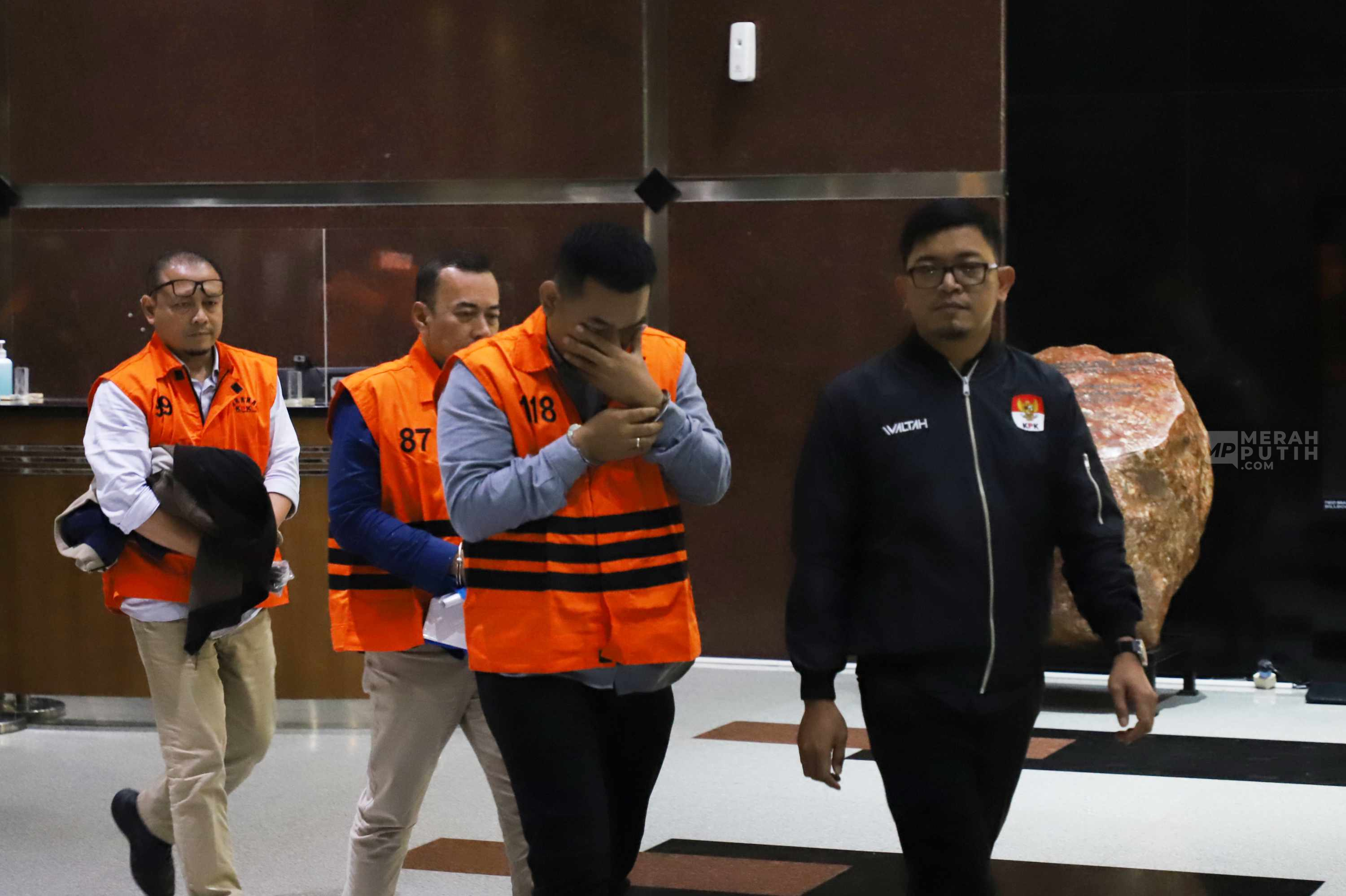 Tersangka kasus dugaan tindak pidana korupsi perkara suap importasi di Direktorat Jenderal Bea dan Cukai (DJBC) Orlando Hamongan (kiri) dan Rizal Fadillah (kedua kiri) berjalan menggunakan rompi tahanan usai menjalani pemeriksaan di Gedung Merah Putih KPK, Jakarta, Jumat (6/2/2026).