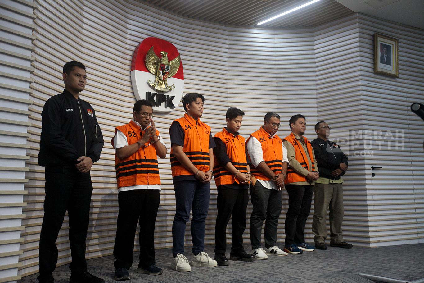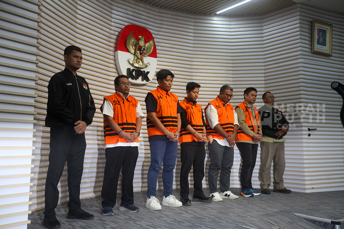 Merahputih.com - Tersangka Dugaan Suap Pembangunan RSUD Kolaka Timur Sulawesi Tenggara Bupati Kolaka Timur Abdul Azis Andi Lukman Hakim selaku PIC Kemenkes untuk Pembangunan RSUD, Ageng Dermanto selaku PKK proyek Pembangunan RSUD di Kolaka Timur, Deddy Karnady selaku pihak swasta PT PCP dan Arif Rahman selaku pihak swasta PT PCP saat penetapan dalam konferensi pers oleh KPK di Gedung Merah Putih KPK, Kuningan, Jakarta, Sabtu (9/8/2025).