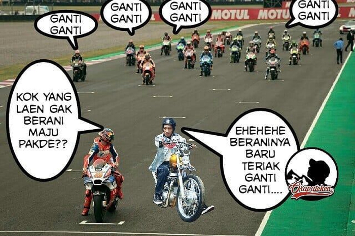 Aksi keren Jokowi yang menjadi pusat perhatian tersebut rupanya juga mengundangan tangan-tangan kreatif para membuat meme lucu. Alhasil, baru-baru ini beredar beberapa meme lucu Jokowi naik chopper.