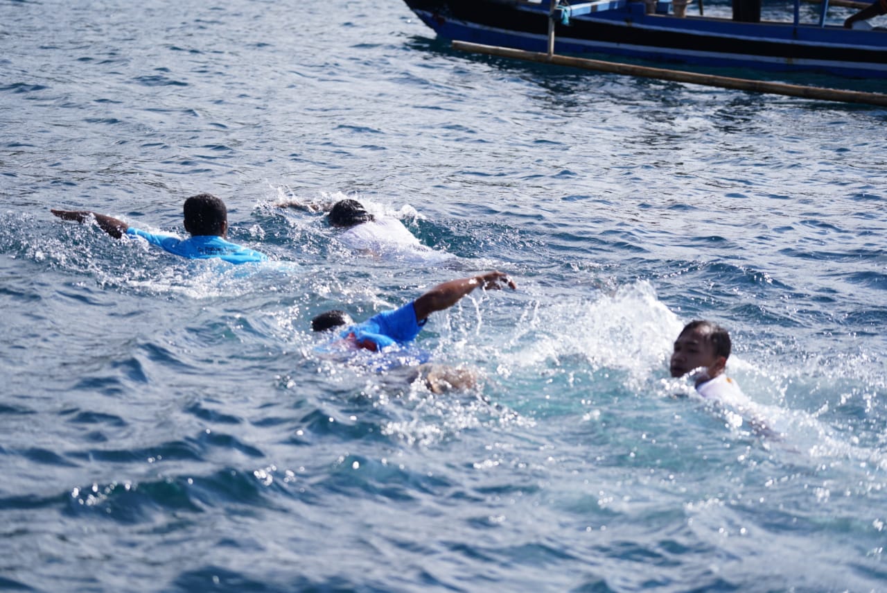 MerahPutih.com - Calon wakil presiden nomor urur 02 Sandiaga Uno, berenang di Teluk Doreri di Mansinam Manokwari, Papua, menuju ke Hotel Mansinam Beach untuk berbincang dengan tokoh masyarakat di sana, Rabu (27/3).