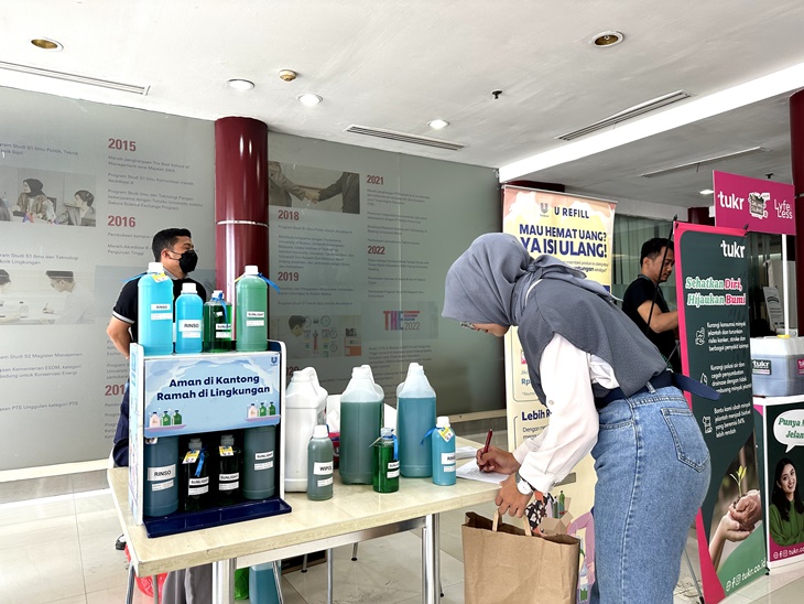 Di area 'Refill Corner Unilever', pengunjung membeli berbagai jenis produk rumah tangga dari Unilever. Mereka hanya perlu membawa kemasan atau wadah sendiri untuk pengisian ulang.