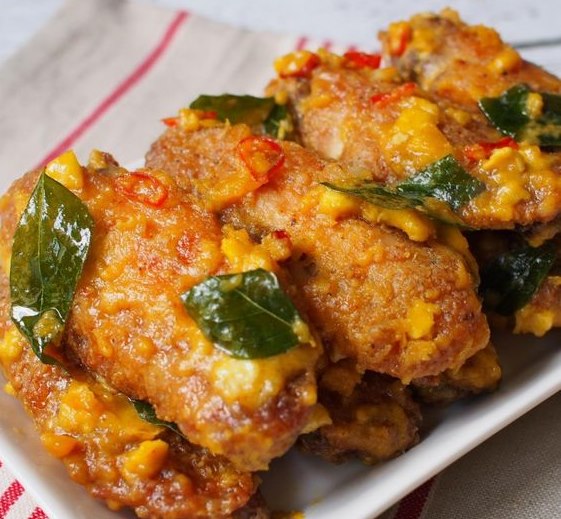 Hidangan yang satu ini datangnya dari negeri jiran, Singapura. Bentuknya, ayam yang digoreng dengan balutan tepung hingga renyah lalu disiram saus telur asin yang gurih. Biasanya salted egg chicken disajikan dengan nasi putih dan diberi topping telur mata sapi. Lezat!
