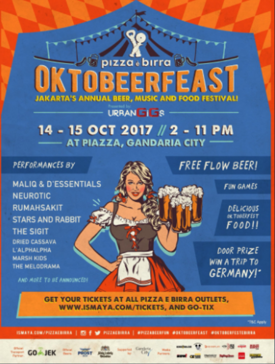 PESTA bir tahunan, Pizza e Birra Oktobeerfeast, akan segera hadir pada 14-15 Oktober mendatang. Selama acara berlangsung, pengunjung dapat berpesta minum bir dan makan sambil mendengarkan pertunjukan musik di Piazza, Gandaria City, Jakarta.