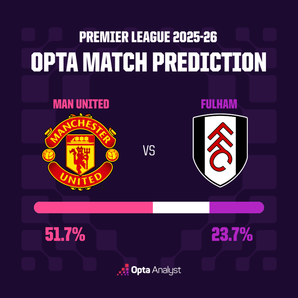 Berdasarkan analisis Opta Supercomputer, Manchester United jauh lebih diunggulkan dengan persentase kemenangan mencapai 51,7%. Di sisi lain, Fulham hanya diberi peluang menang sebesar 23,7%, sementara potensi hasil imbang berada di angka 24,6%.