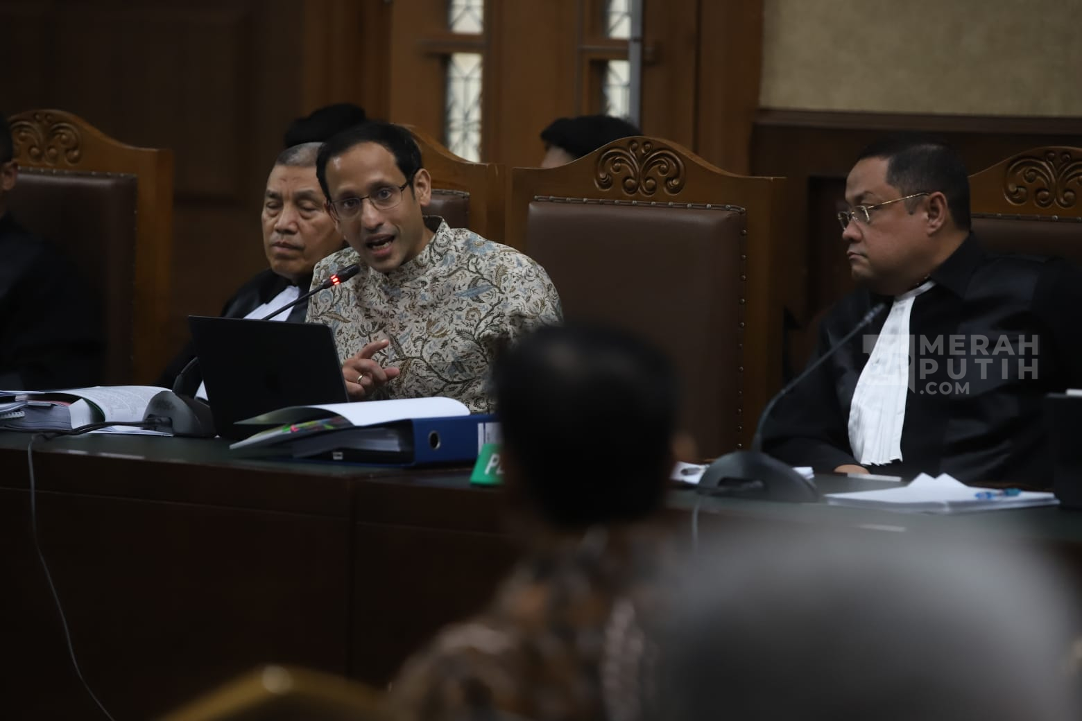 Dalam perkara tersebut, Nadiem Makarim diduga memperkaya diri sebesar Rp809 miliar dari pengadaan laptop Chromebook. JPU juga sudah mendakwa Nadiem merugikan negara melalui digitalisasi Pendidikan melalui pengadaan laptop Chromebook dan juga sistem Chrome device management yang diduga merugikan negara mencapai Rp2,18 triliun.Nadiem dan tim kuasa hukumnya secara konsisten selama persidangan berlangsung membantah klaim tersebut di mana dirinya menyatakan bahwa nilai proyek tender ini sebesar Rp609 miliar. Menurut mereka, bagaimana mungkin dengan nilai tersebut Nadiem Makarim mendapat keuntungan Rp809 miliar. (Foto: MP/Didik Setiawan).