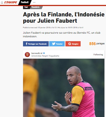 Nah, salah satu media eropa yang menyorotnya di Borneo FC adalah media kenamaan Prancis L'Equipe. Media tersebut memberikan judul, Setelah Finlandia, Indonesia untuk Julien Faubert.
