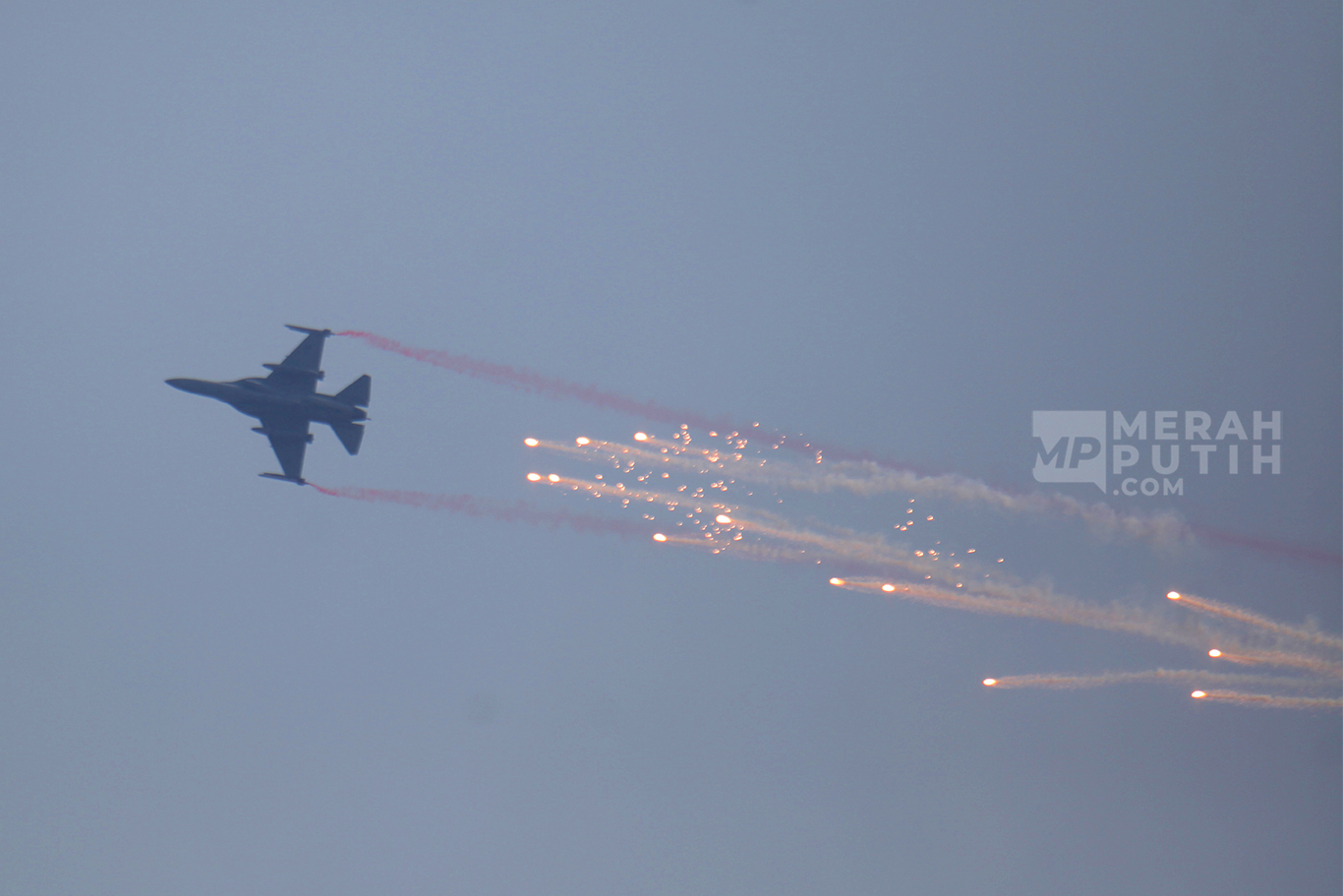 Pesawat tempur itu datang dari berbagai arah dengan suara jet yang menggelegar hingga menjadi pusat perhatian warga yang memadati Monas. Pesawat yang pertama yakni F-16 Fighting Falcon bermanuver dengan istilah High-G Turn.